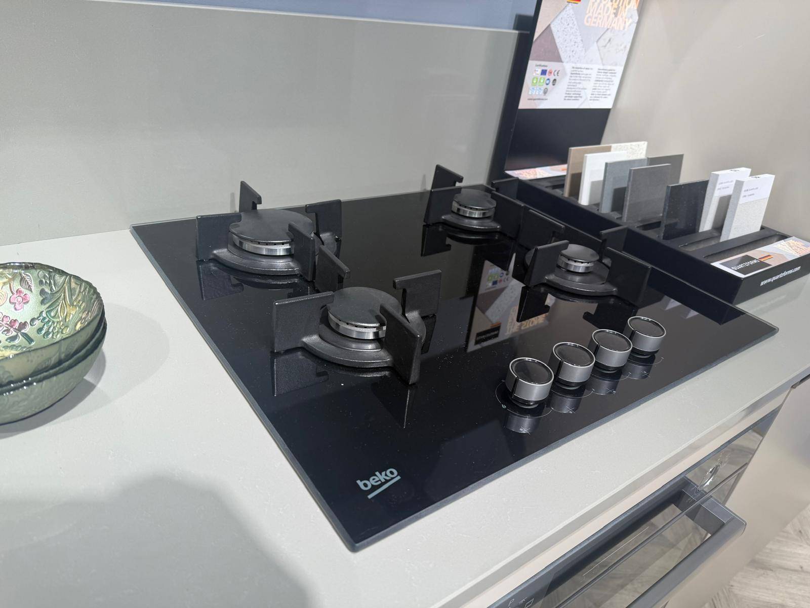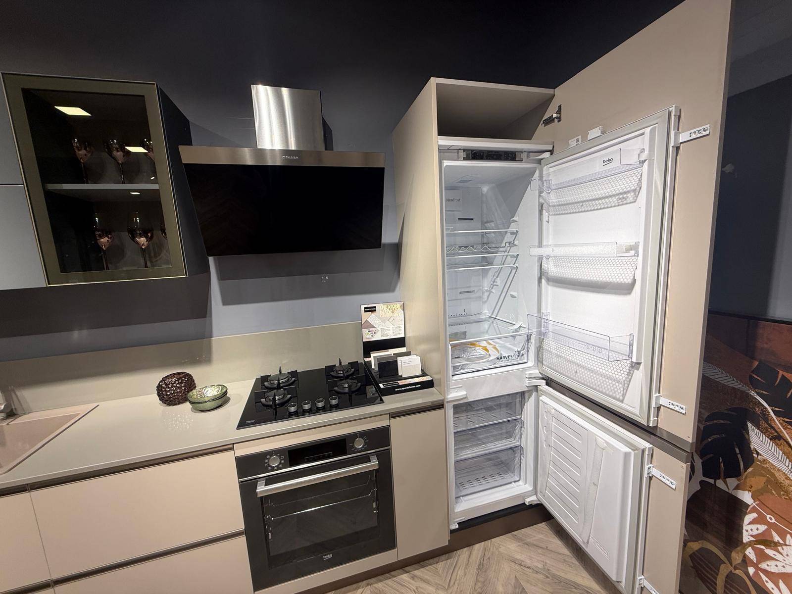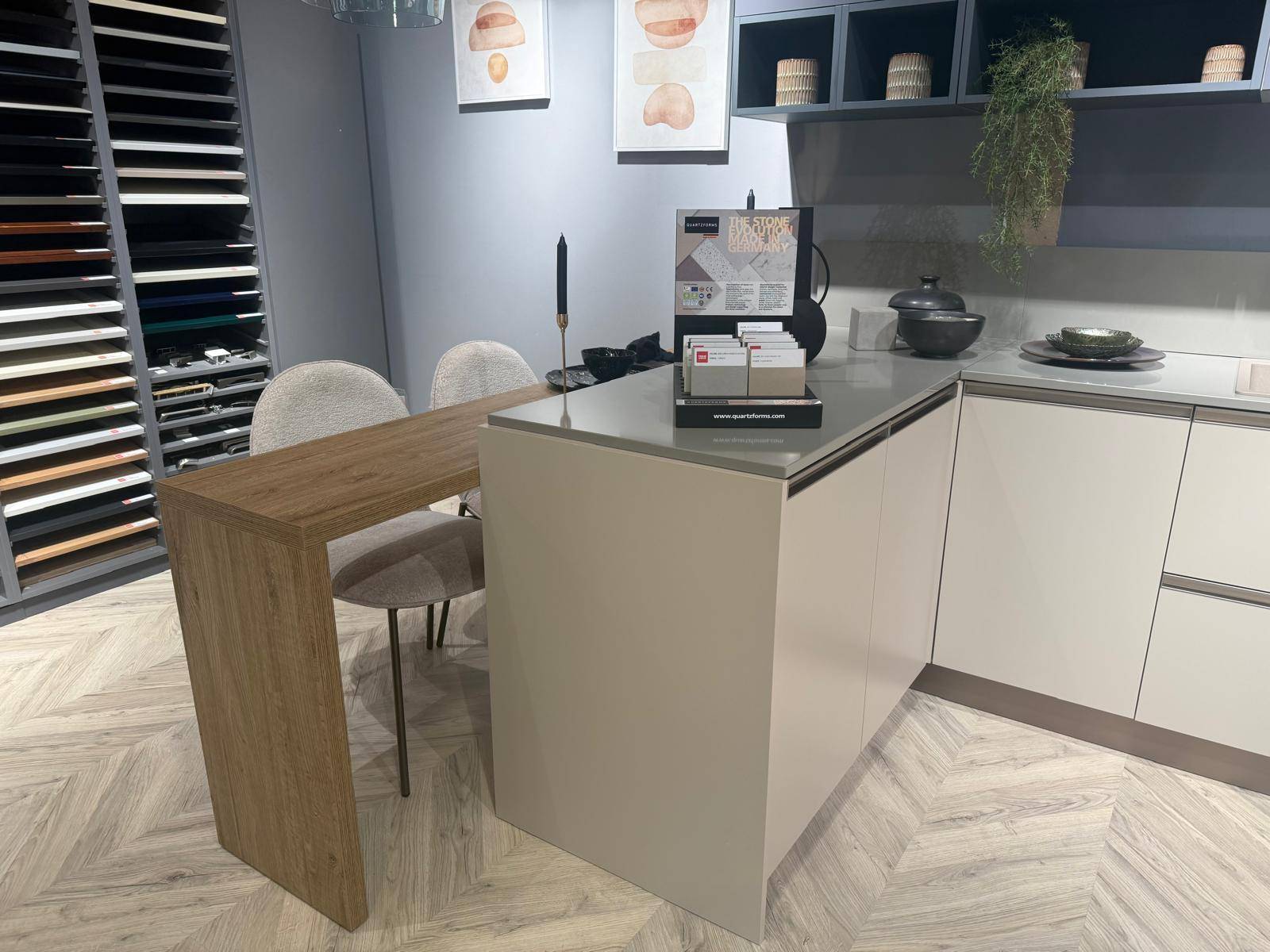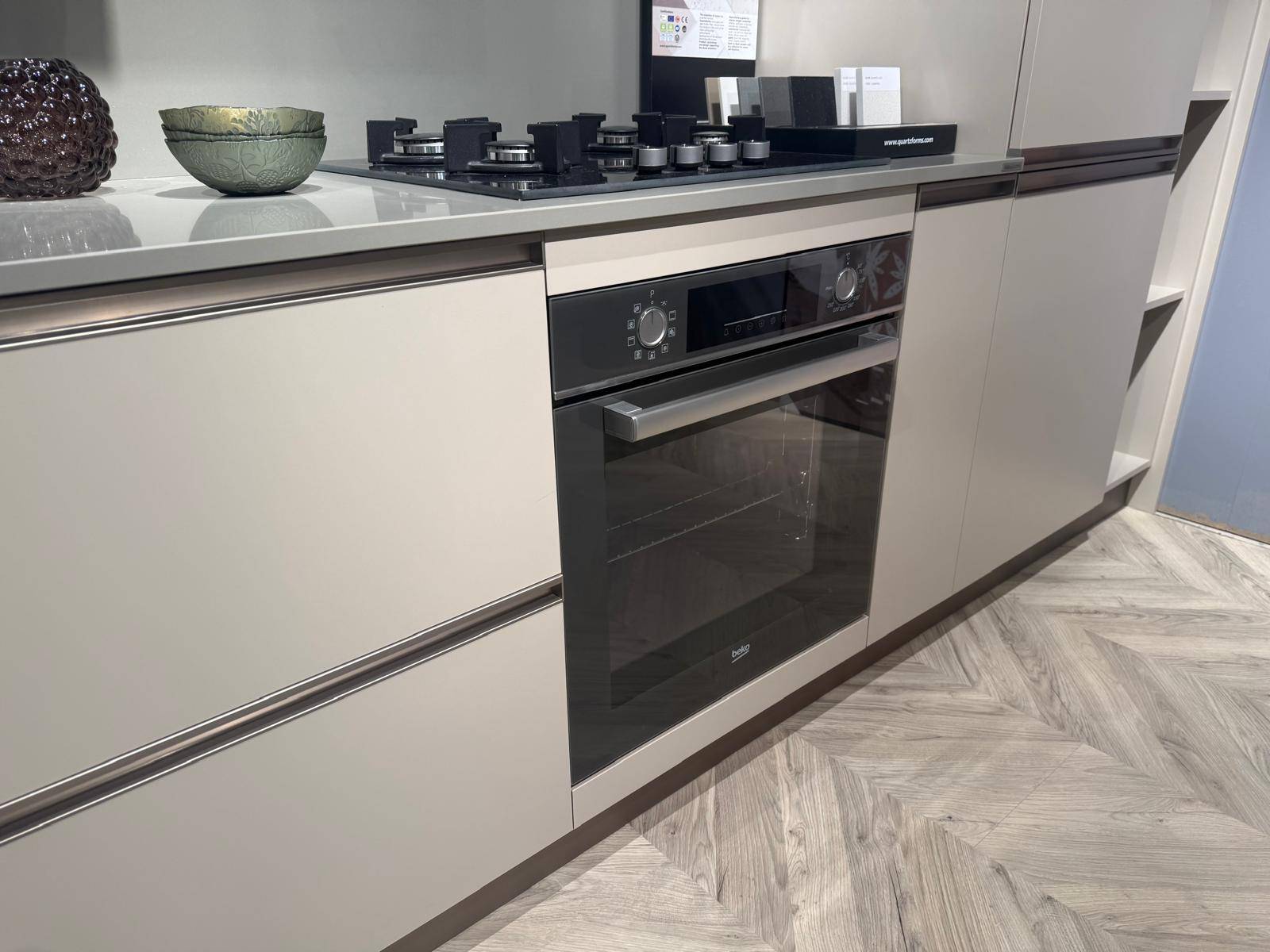 Cucina completa con penisola avente struttura in Grigio Texture, frontali in Nobilitato Canapa e maniglia Aria con linea Champagne.