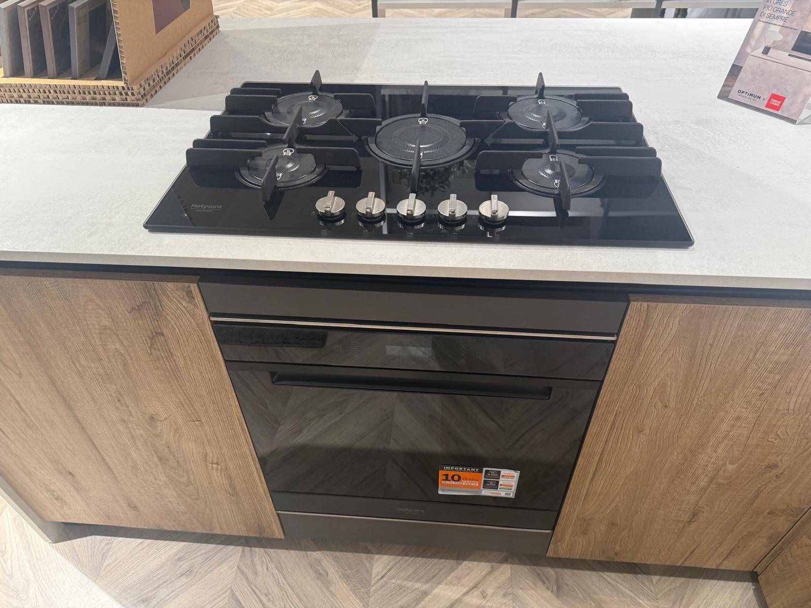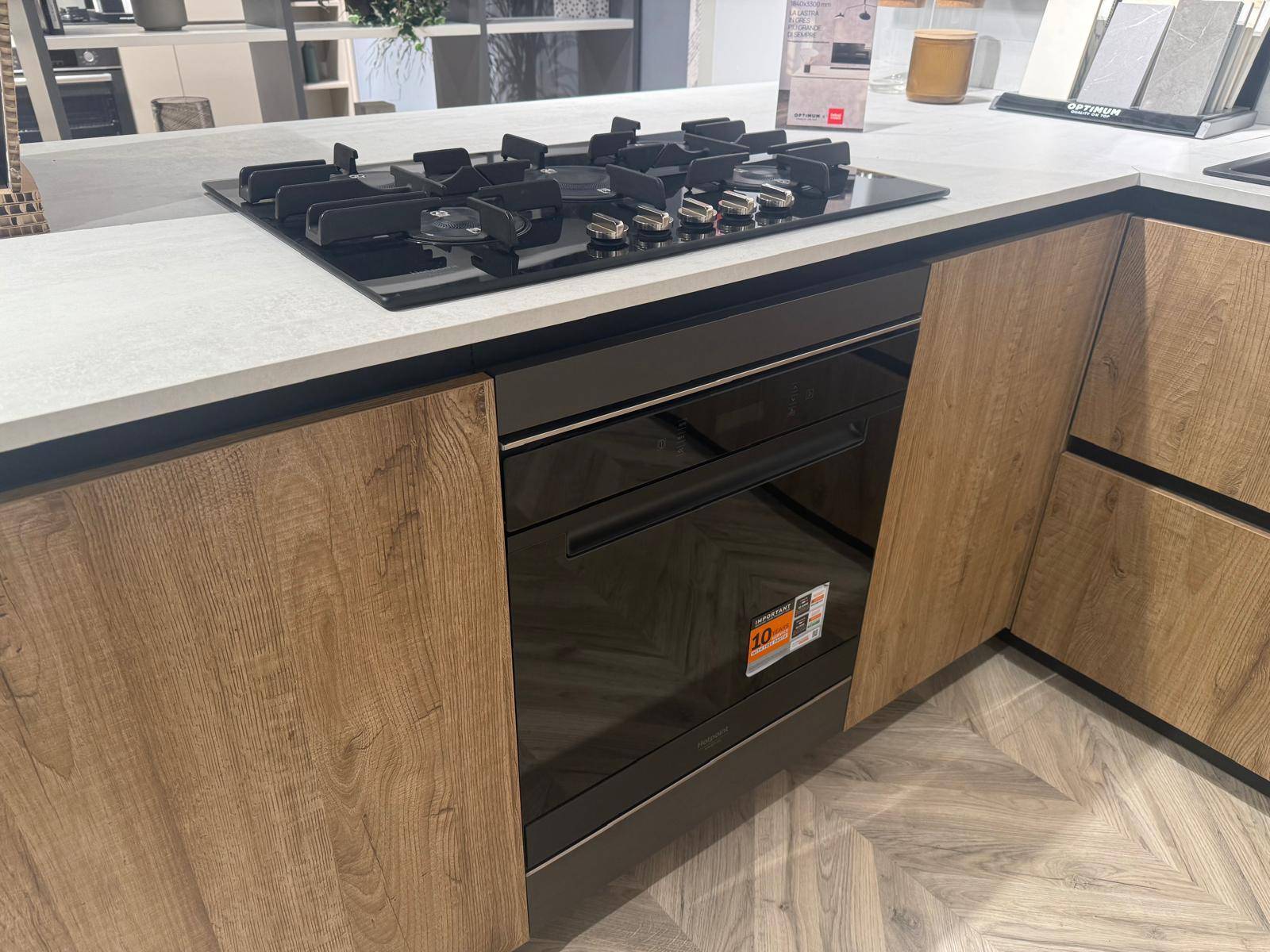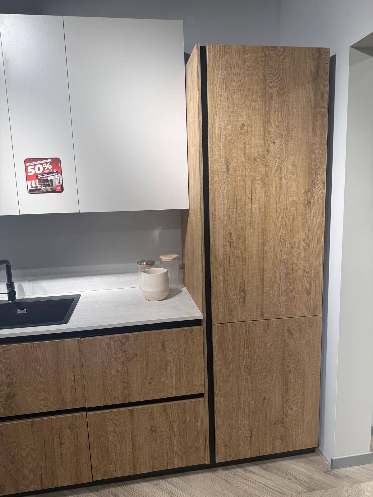 Frontali in Nobilitato Jungle Natural per le basi e la colonna frigo, e in Nobilitato Grigio Dorian per i pensili e la colonna a giorno terminale.