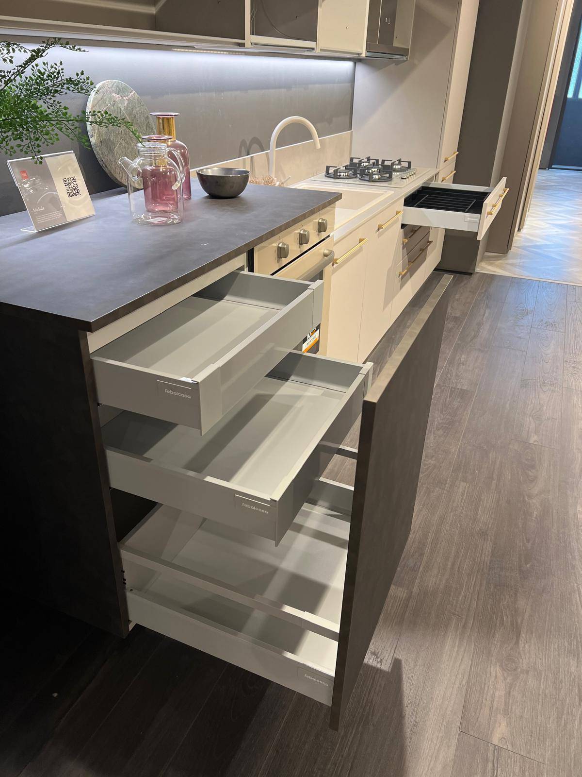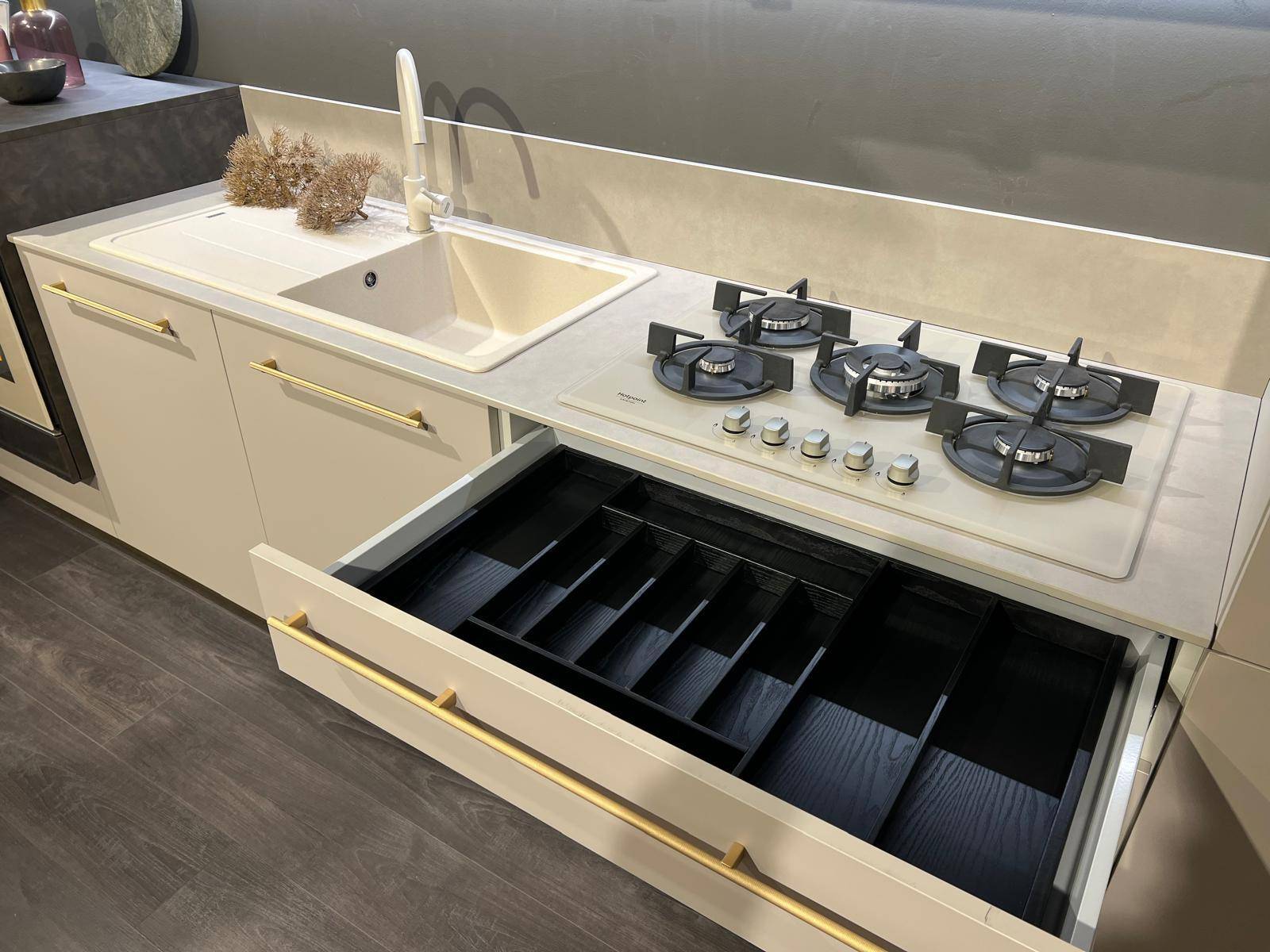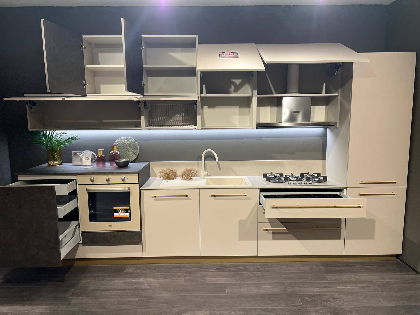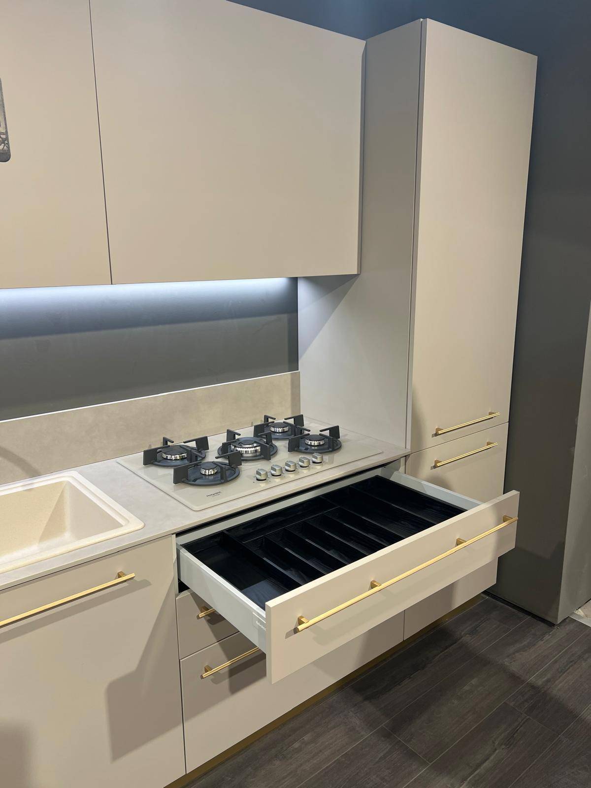 CUCINA MODULA – composizione lineare L. 390 cm, con basi, pensili e colonna in laccato Eccimeri Taupe.