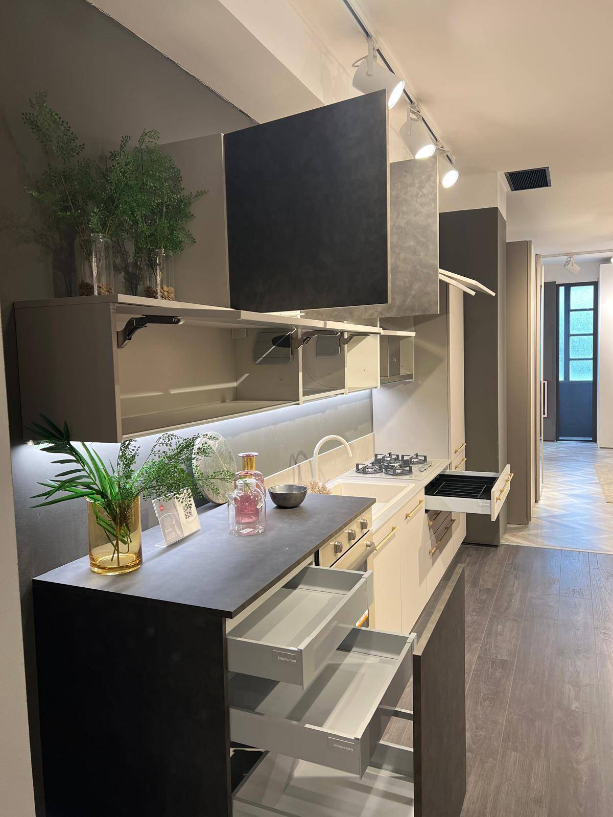 Pensili H. 60 cm e basi tower in laminato Peltro, zoccolo laccato Ottone PVC.