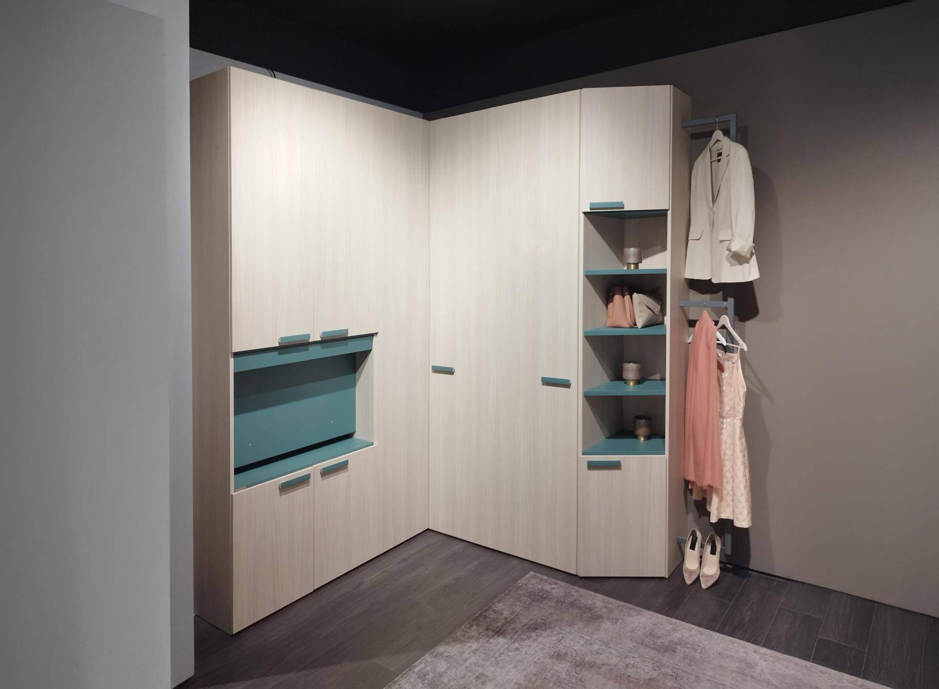 Armadiatura angolare con porta TV integrato, cassettiera interna e n°2 elementi "servo muto"