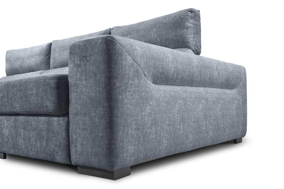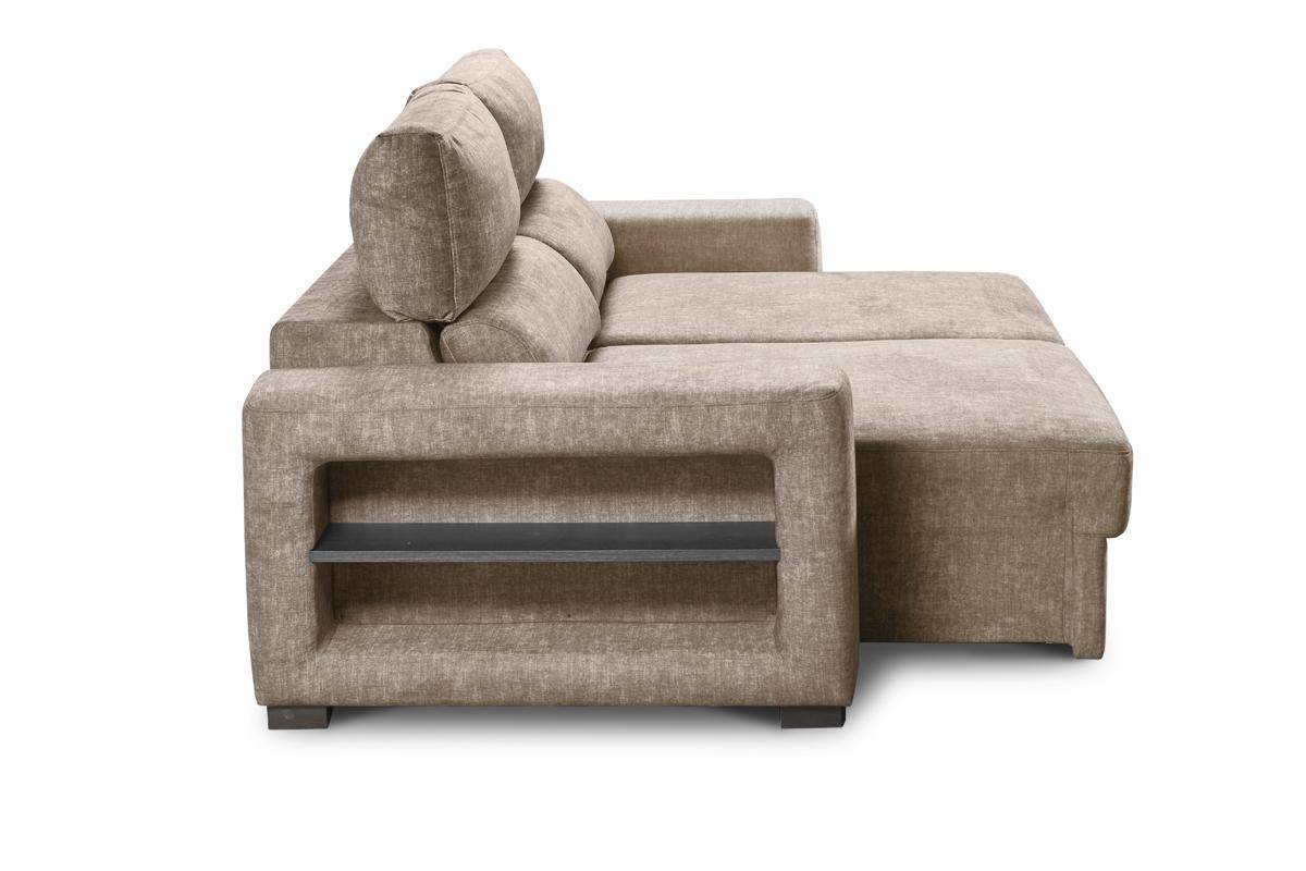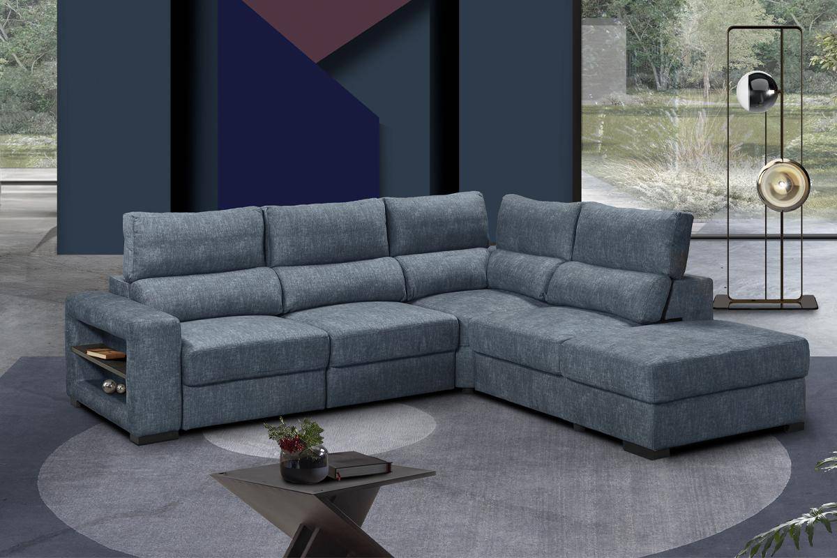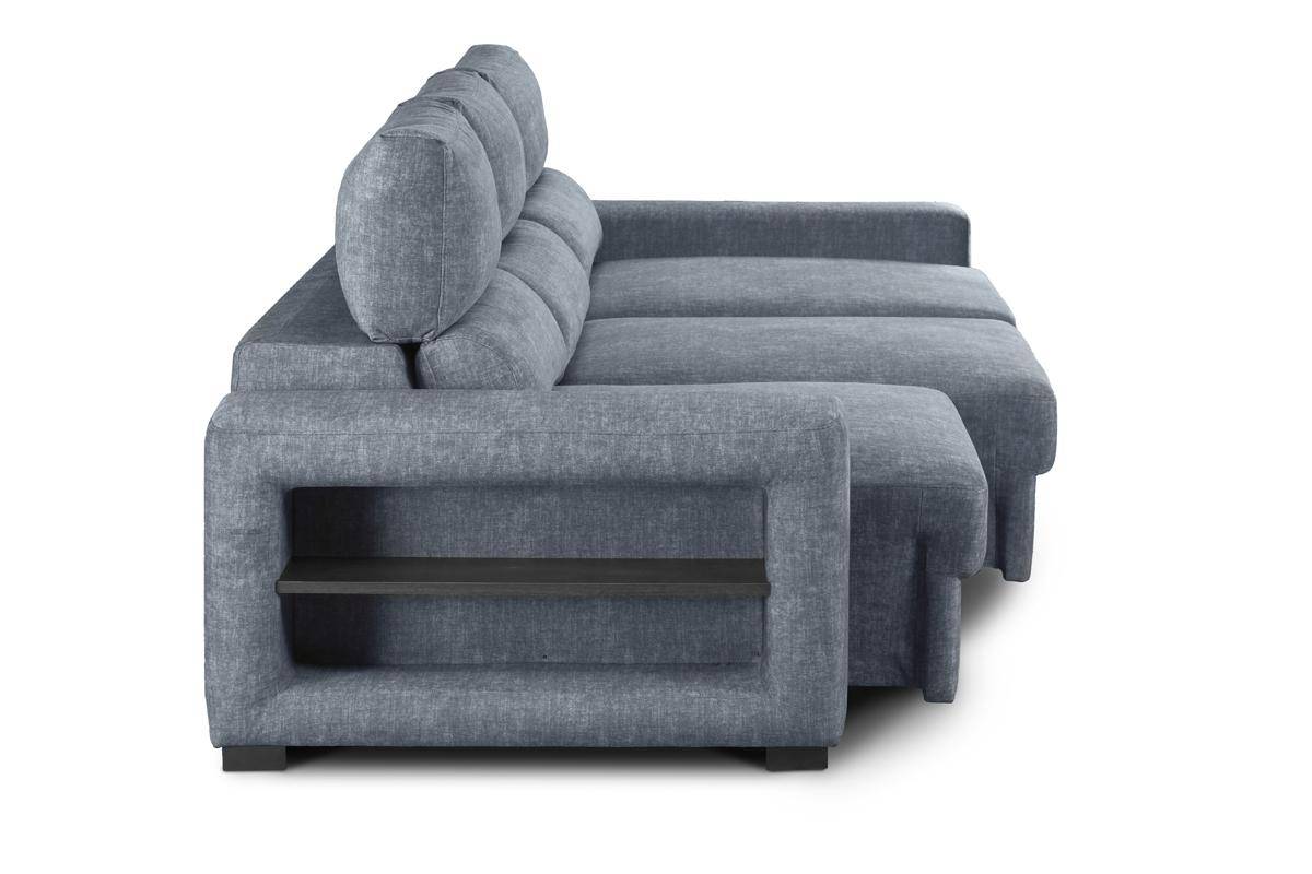 Angolare con 3 slitte manuali e pouf terminale contenitore, in tessuto antimacchia.