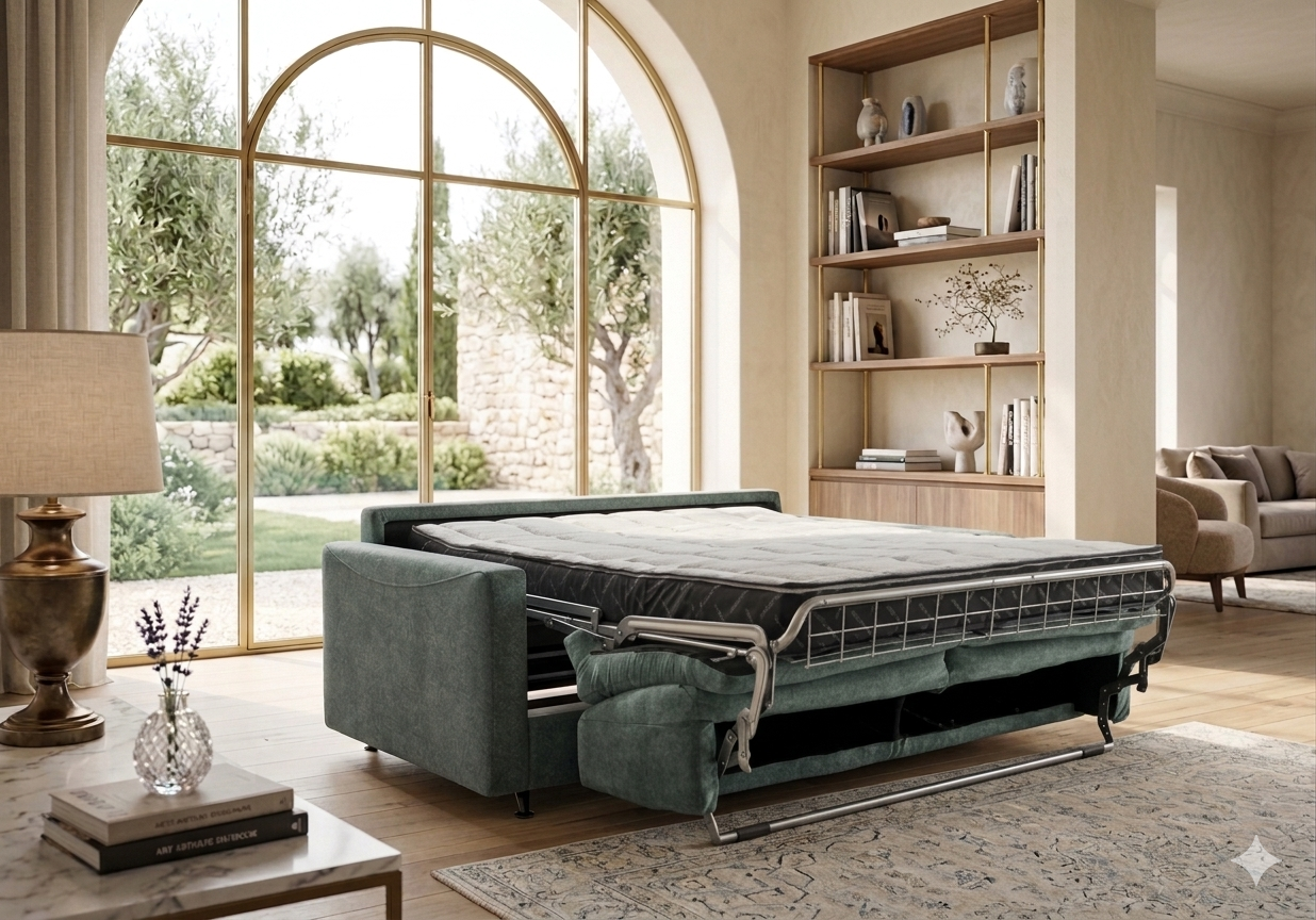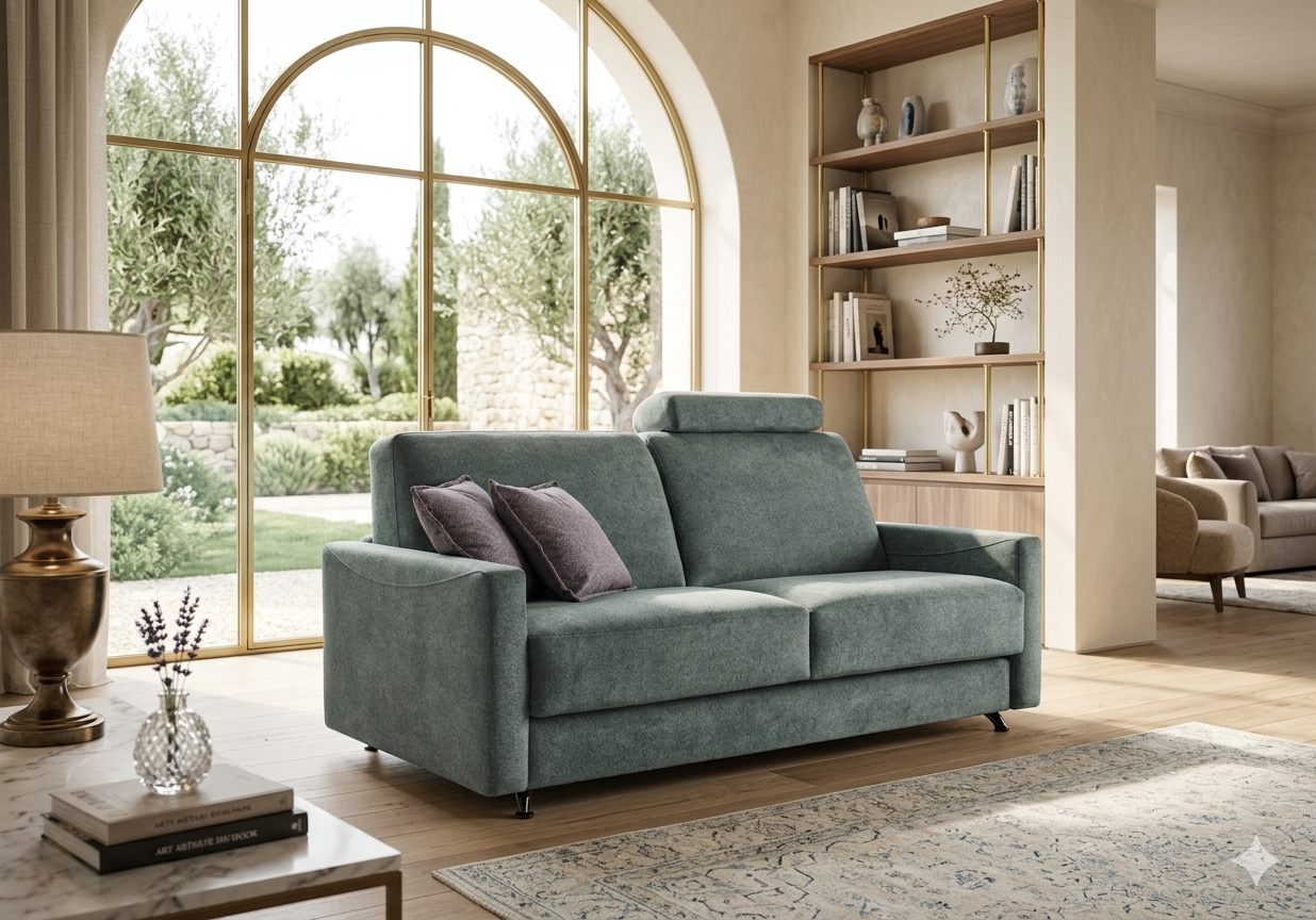 Divano 3 posti con letto e un poggiatesta (materasso140x190 h20 cm), in tessuto tecnico antimacchia Pedro.