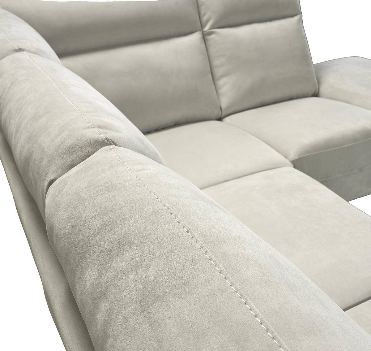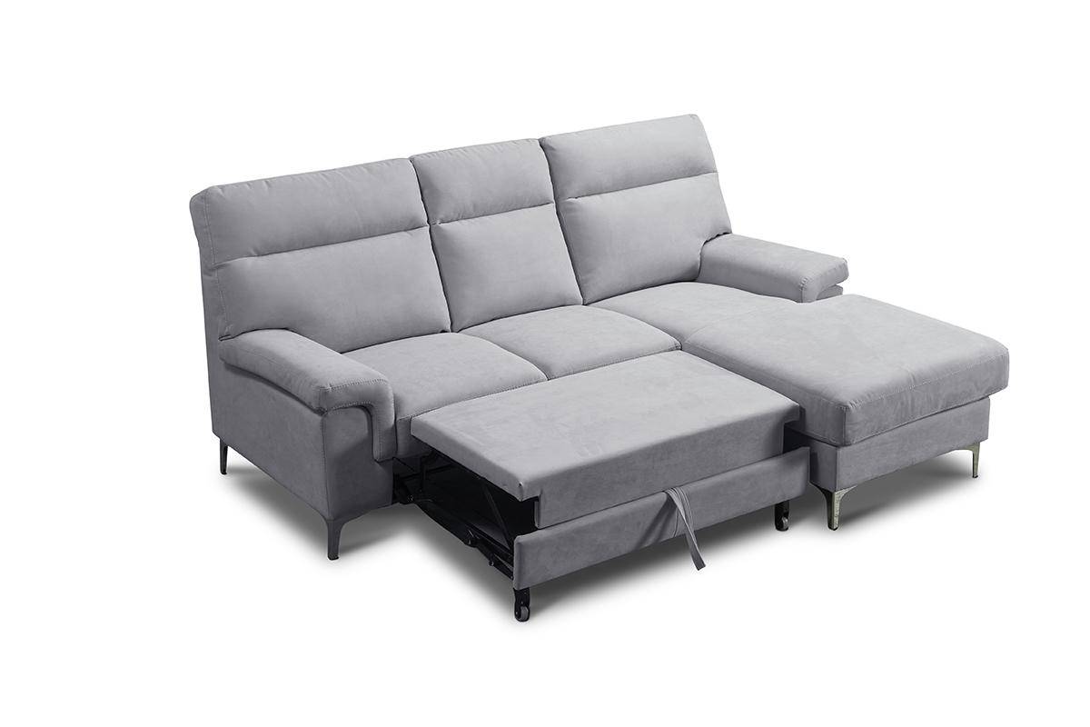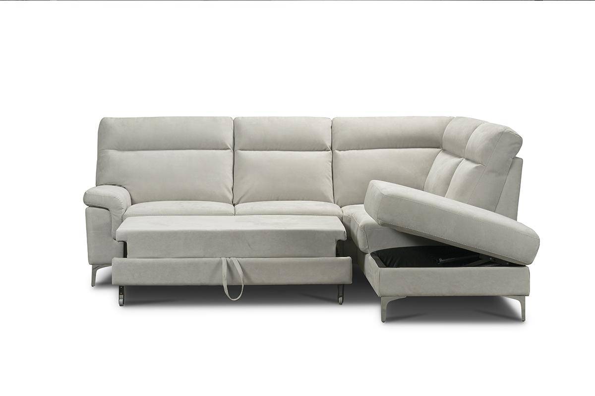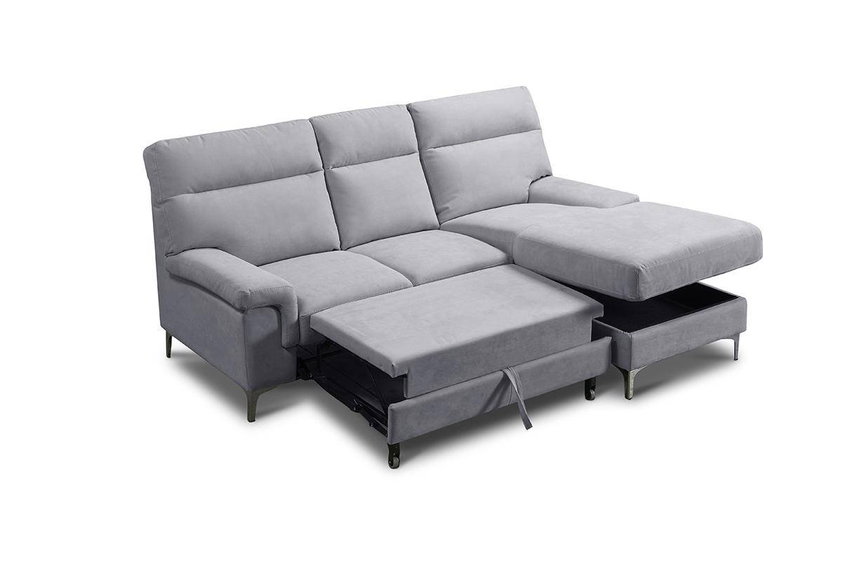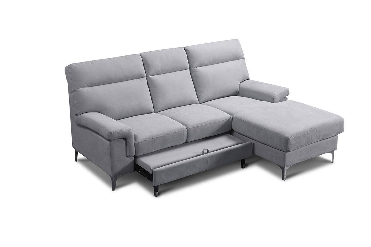 Divano con terminale 2 posti con carrello estraibile e chaise longue con contenitore, in tessuto antimacchia.