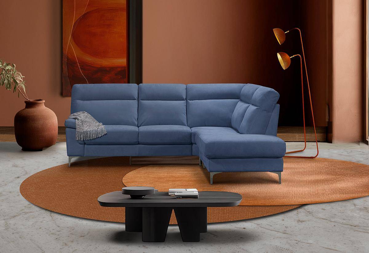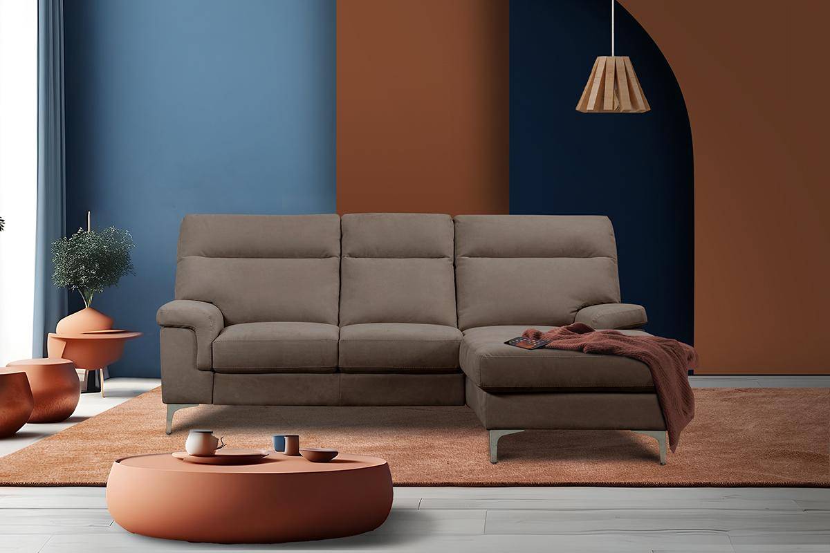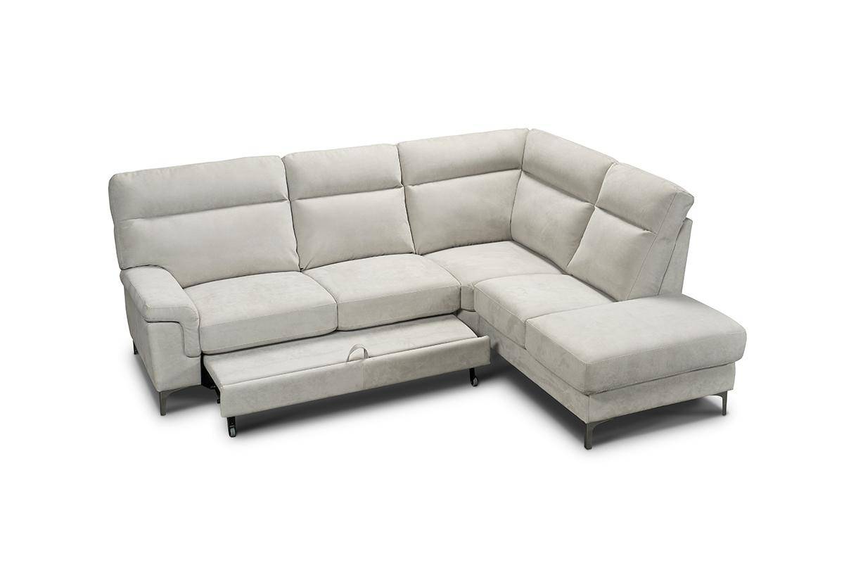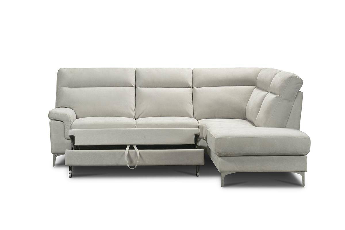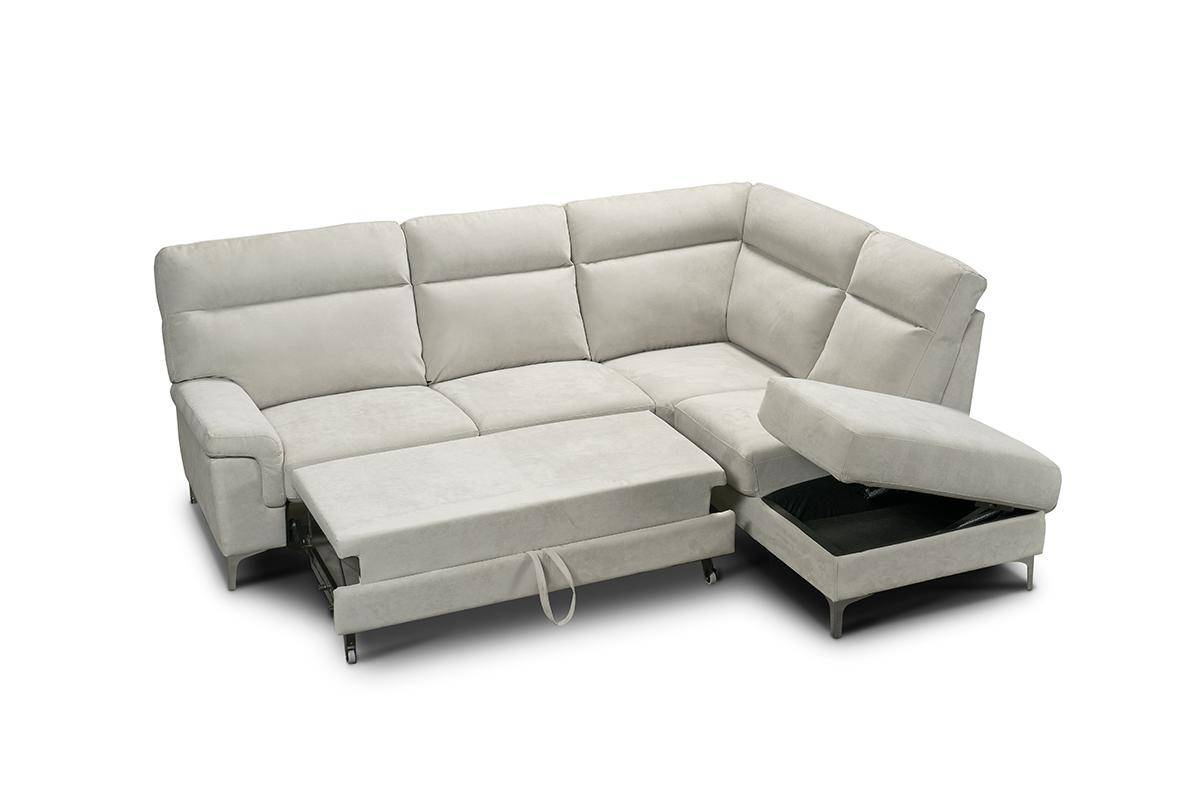 Divano con terminale 2 posti con carrello estraibile e chaise longue con contenitore, in tessuto antimacchia.