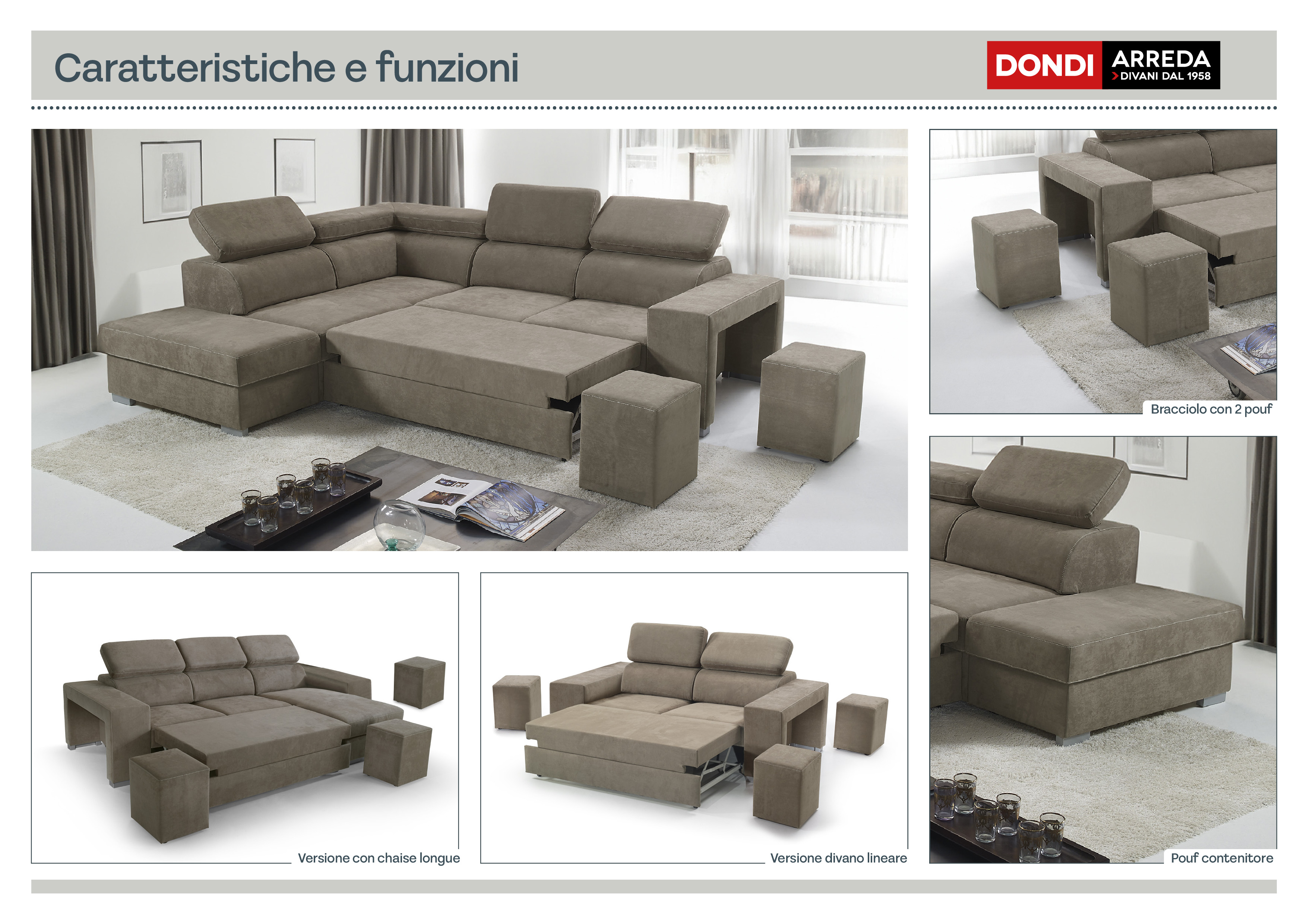 Angolare con maxiseduta “delfino”, bracciolo con 2 pouf e penisola pouf contenitore, in microfibra antimacchia.