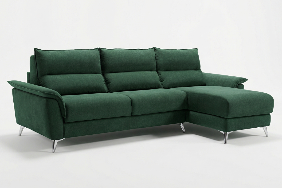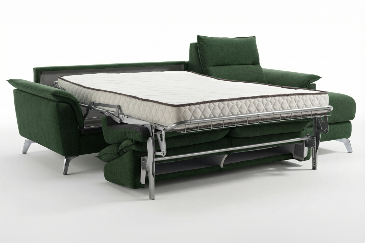 Divano 3 posti con letto e chaise longue reversibile (materasso con aloe 140x190x16 cm), in tessuto antimacchia.