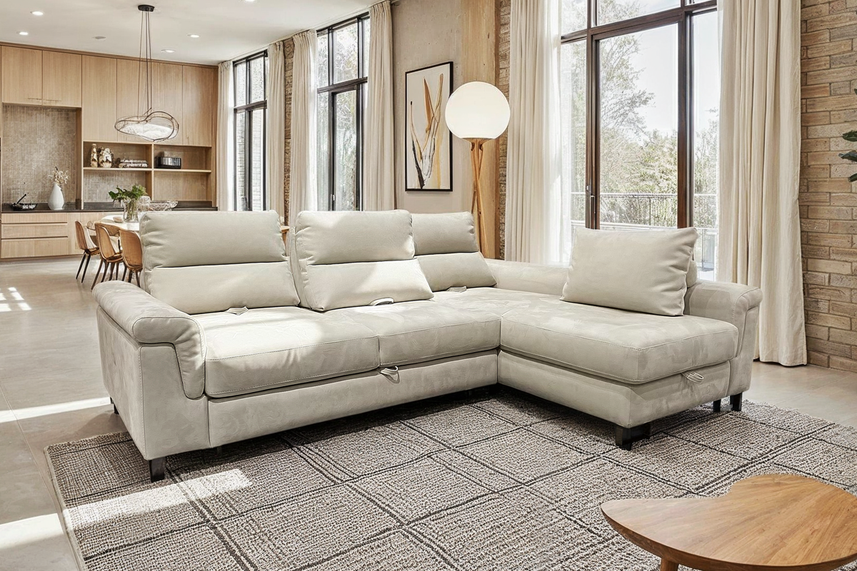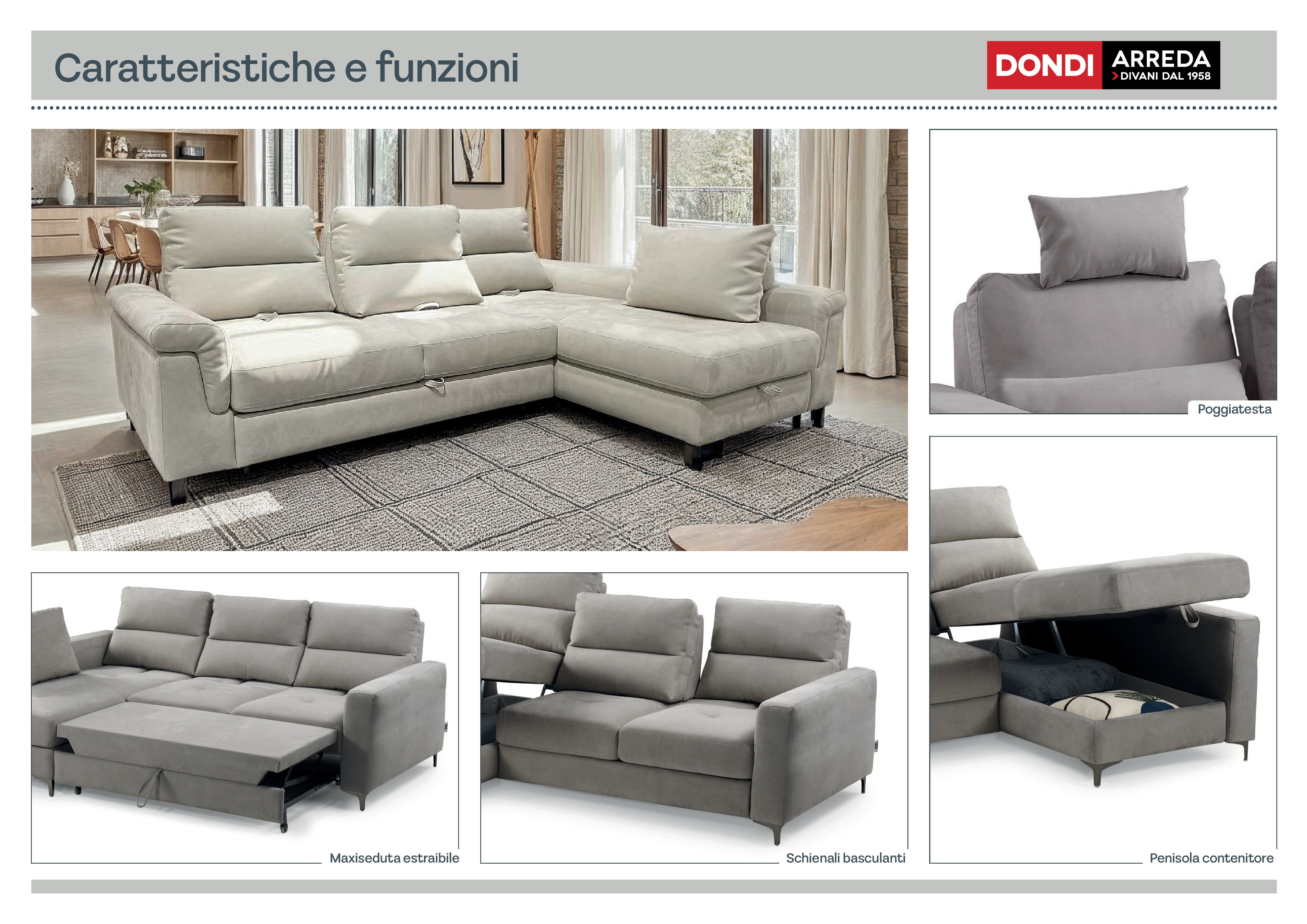 Angolare con terminale intermedio con delfino (carrello) e penisola media con contenitore, in tessuto antimacchia.