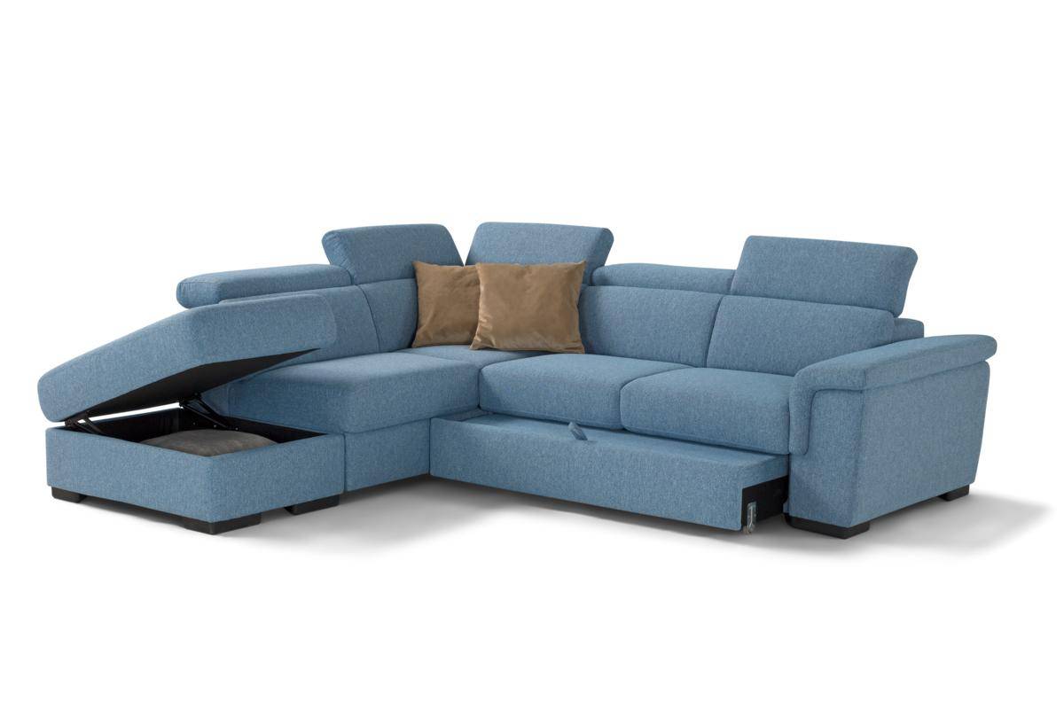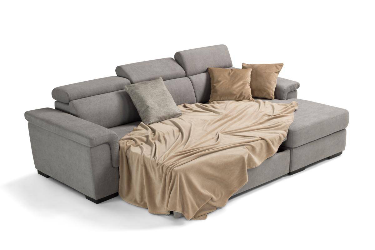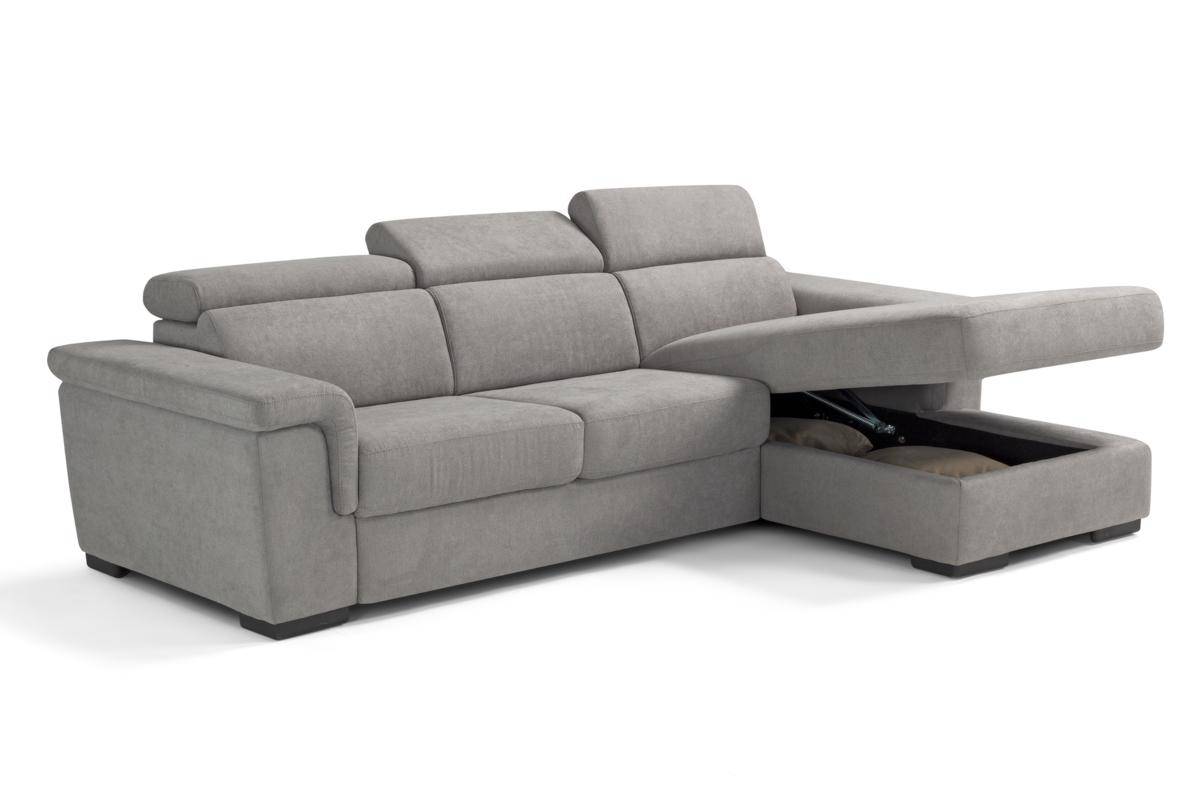 Divano con carrello estraibile e chaise longue contenitore, in tessuto antimacchia.