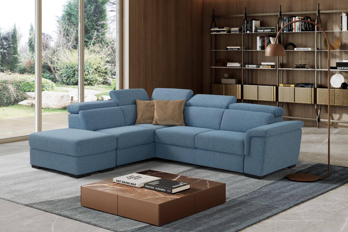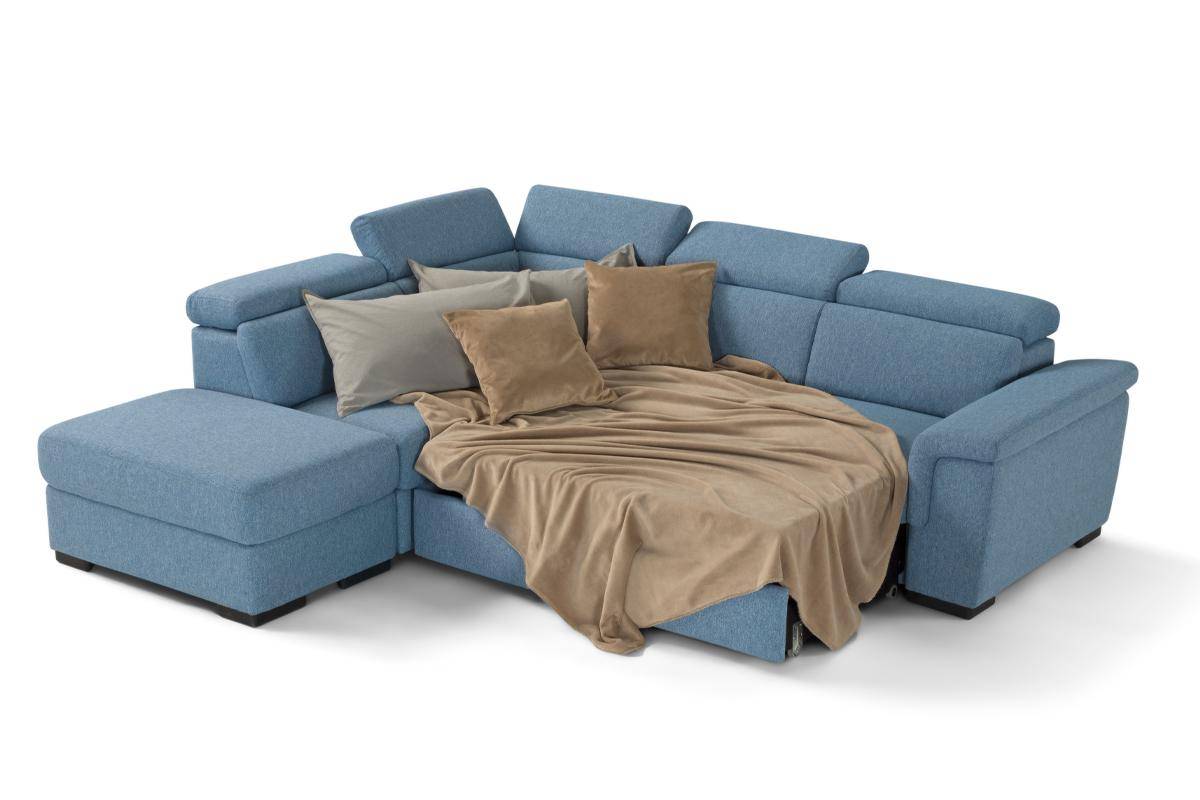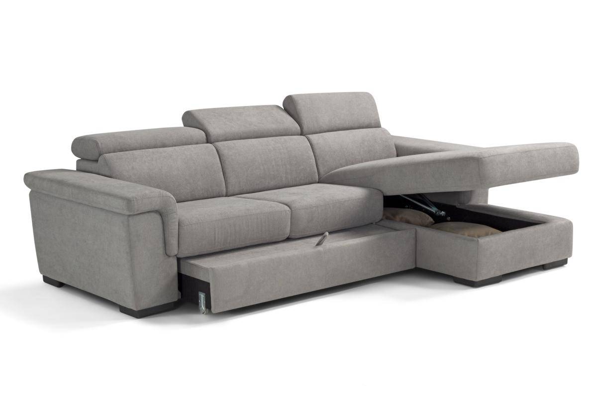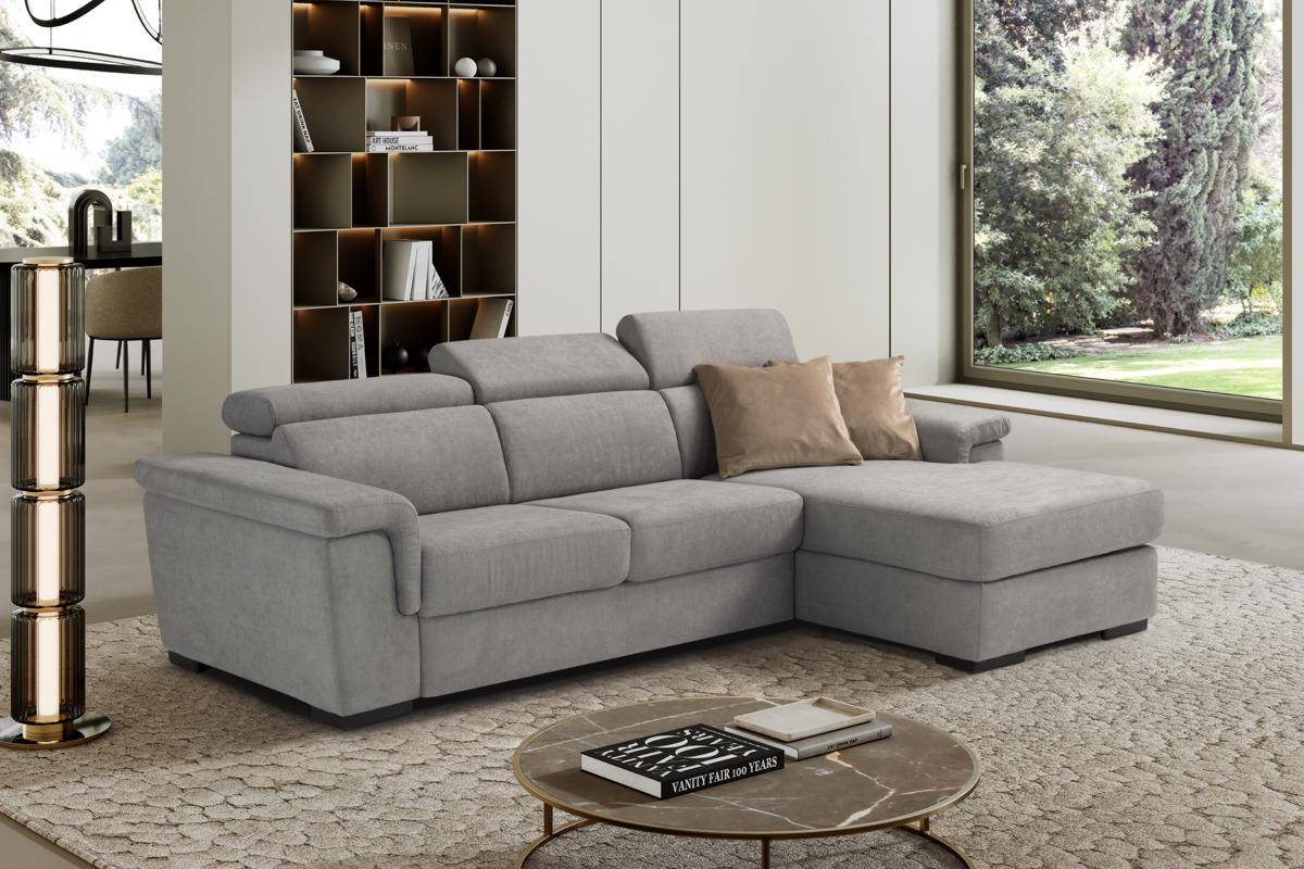 Divano con carrello estraibile e chaise longue contenitore, in tessuto antimacchia.