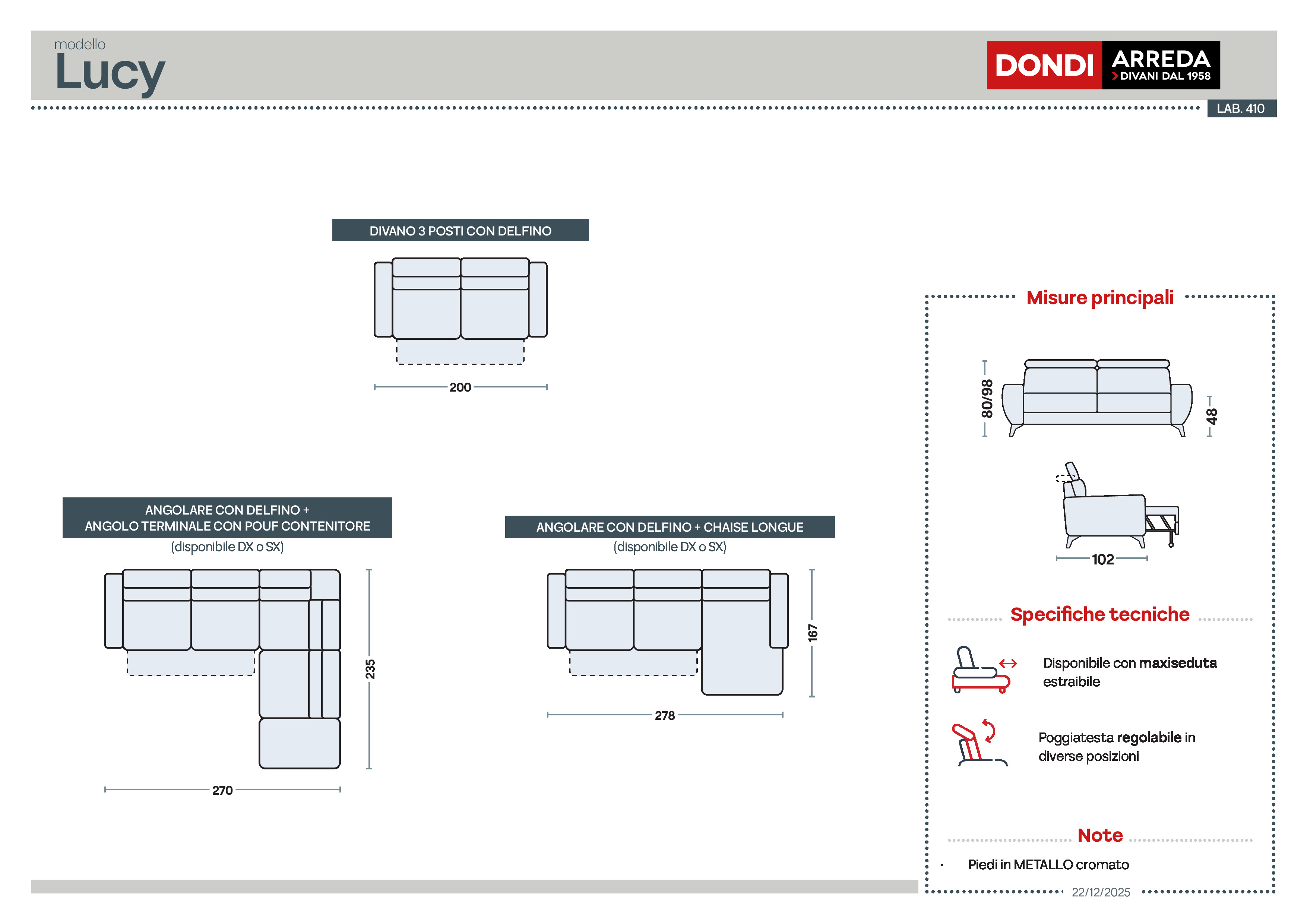 Dimensioni: L. 270 x P. 235 x H. 80/98 cm