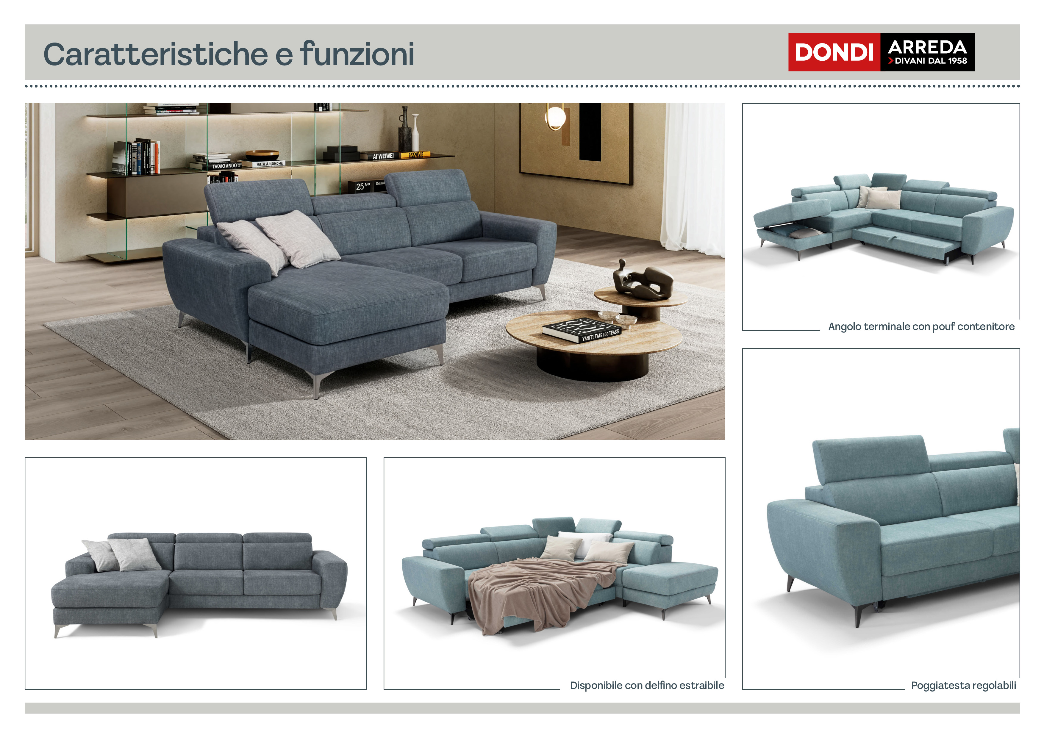 Divano con carrello estraibile e chaise longue fissa, in tessuto Penelope.