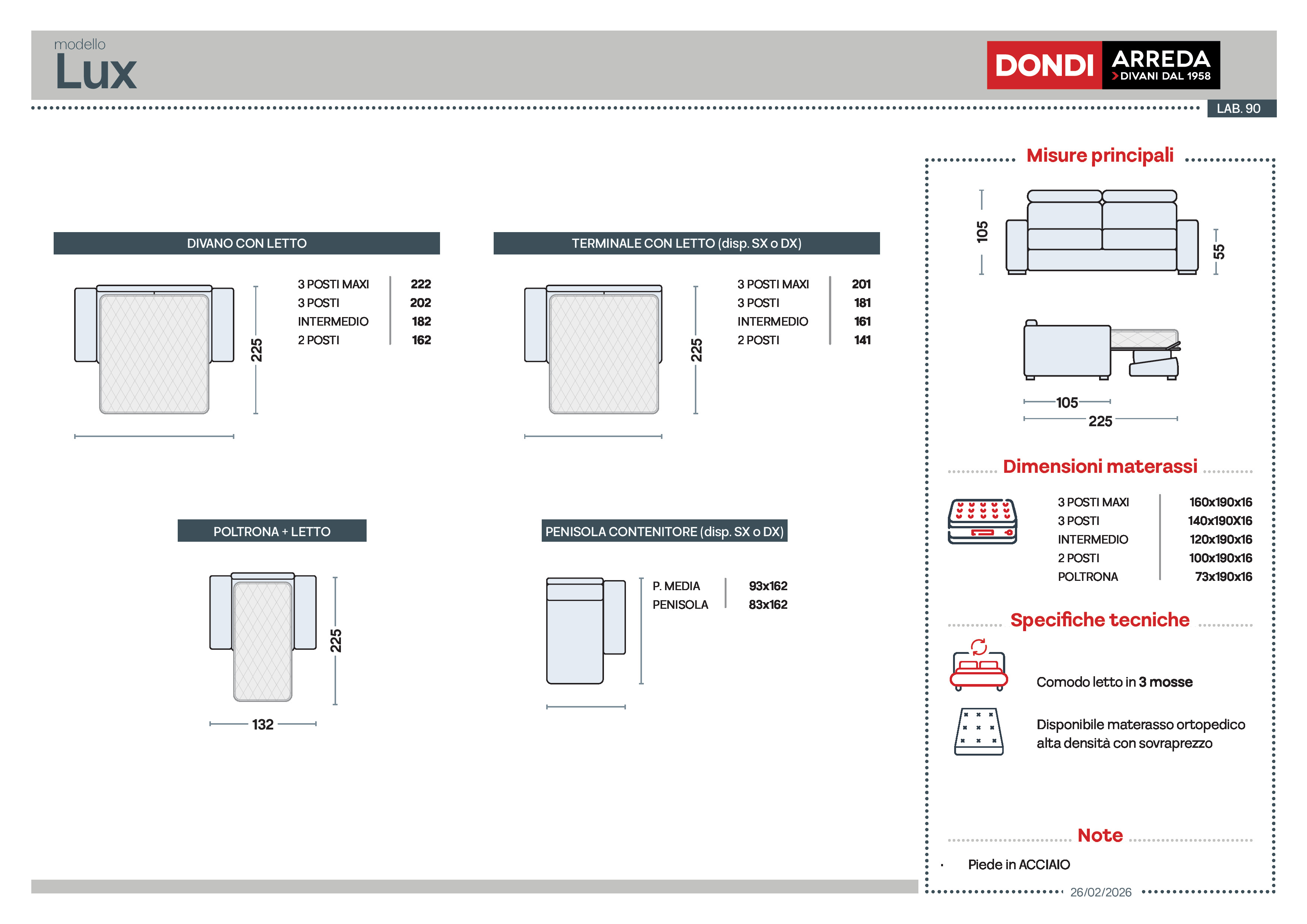Divano 3 posti con letto (materasso con aloe 140x190x16 cm) e penisola contenitore, in tessuto antimacchia.
