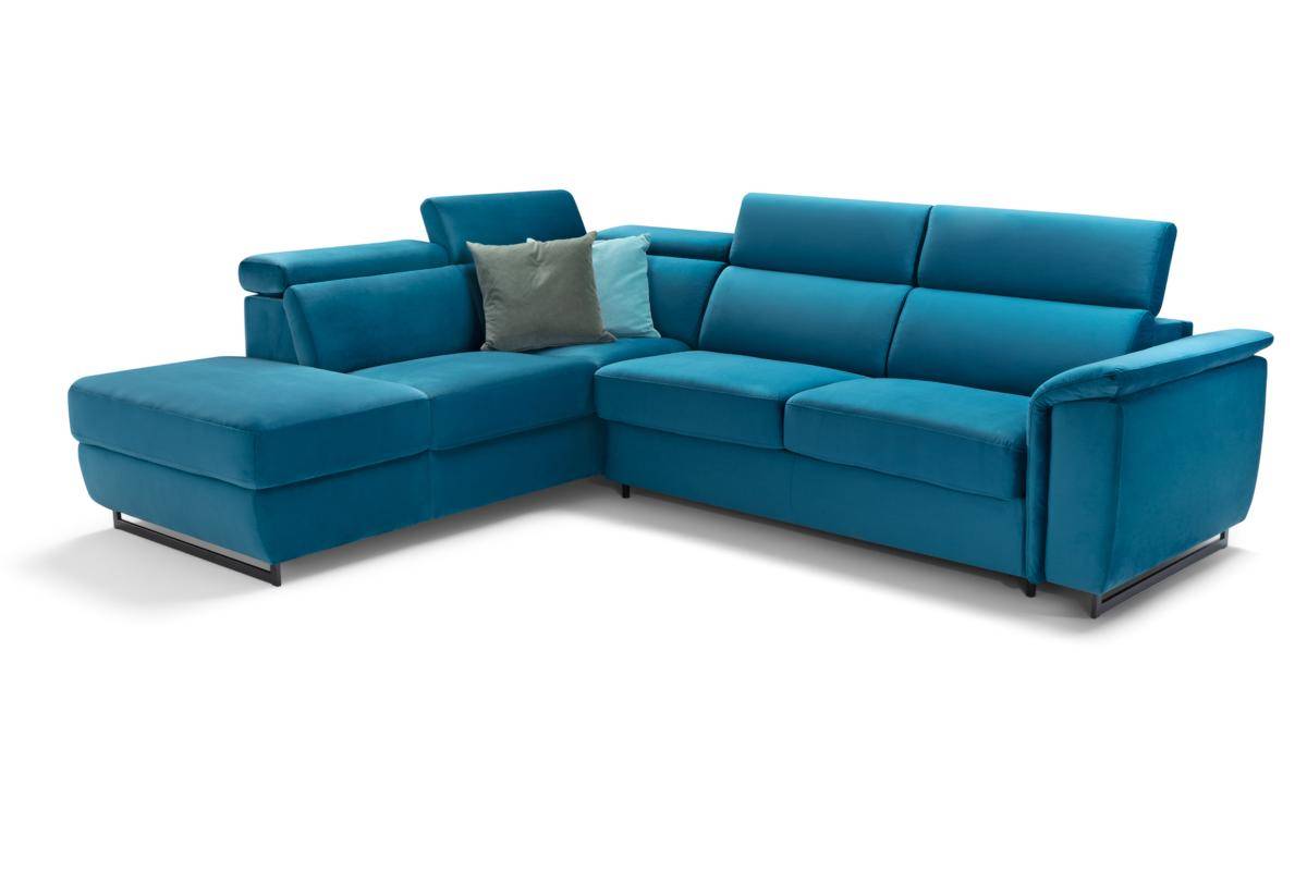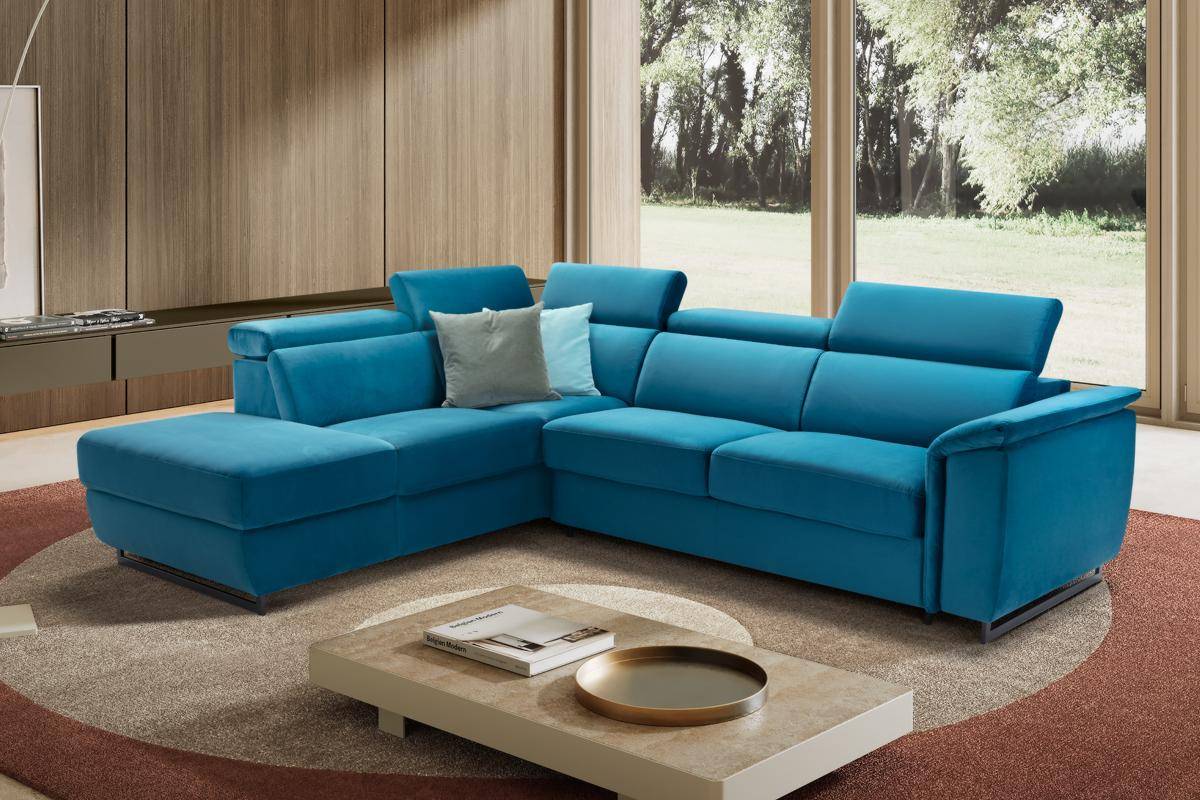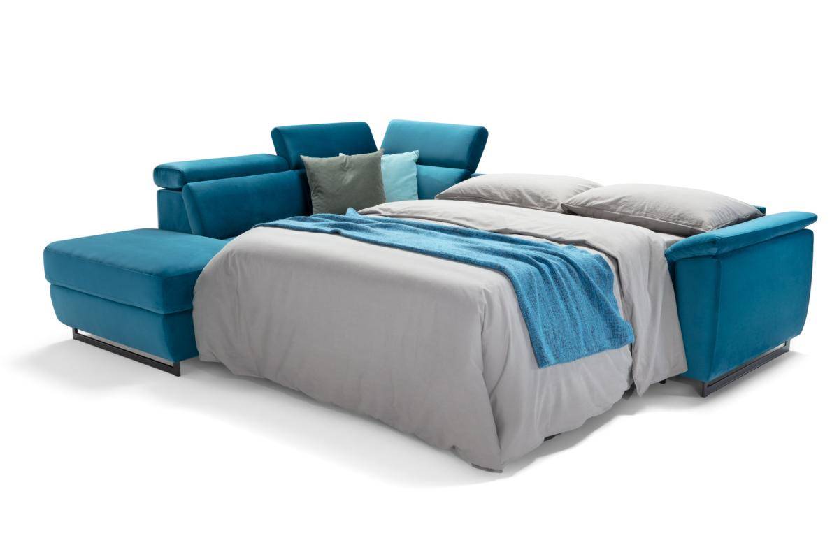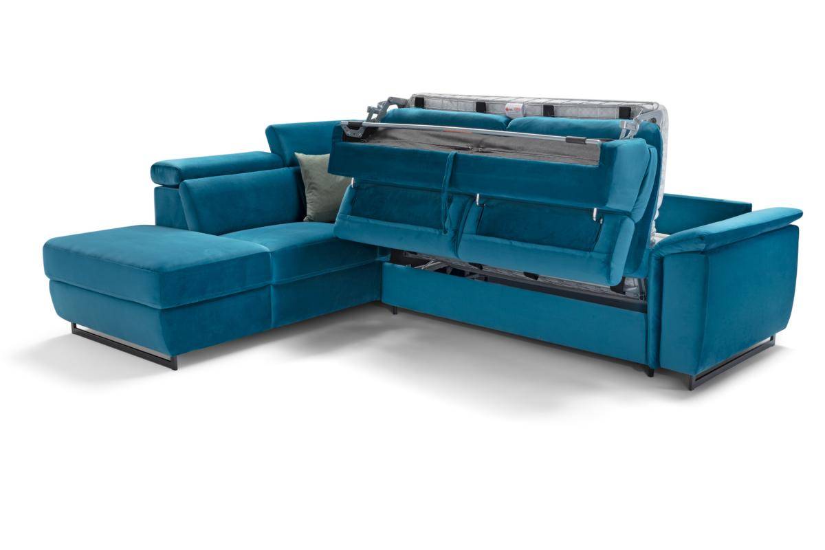 Angolare con letto a ribalta (materasso H.18 cm) e penisola pouf contenitore, in tessuto antimacchia.