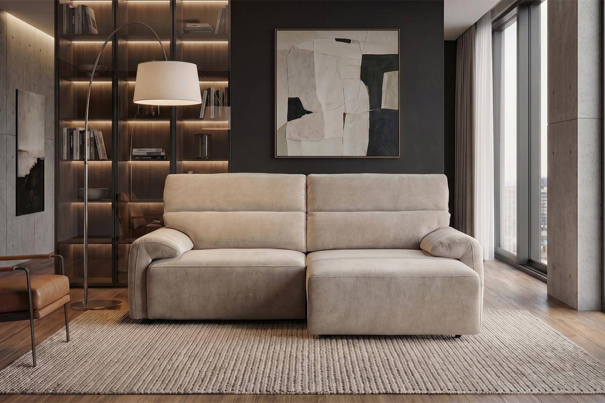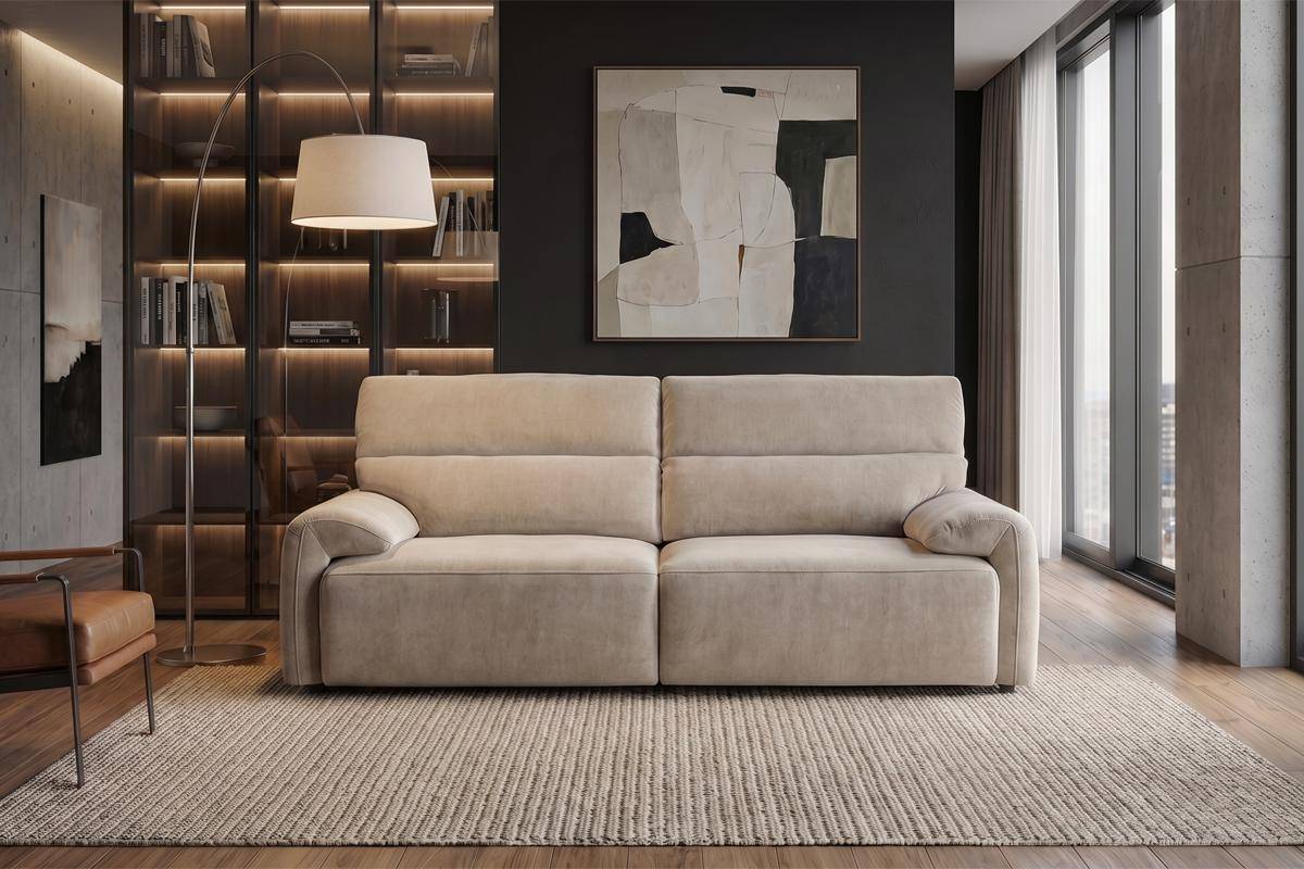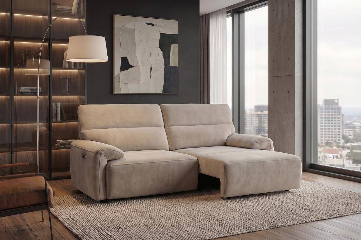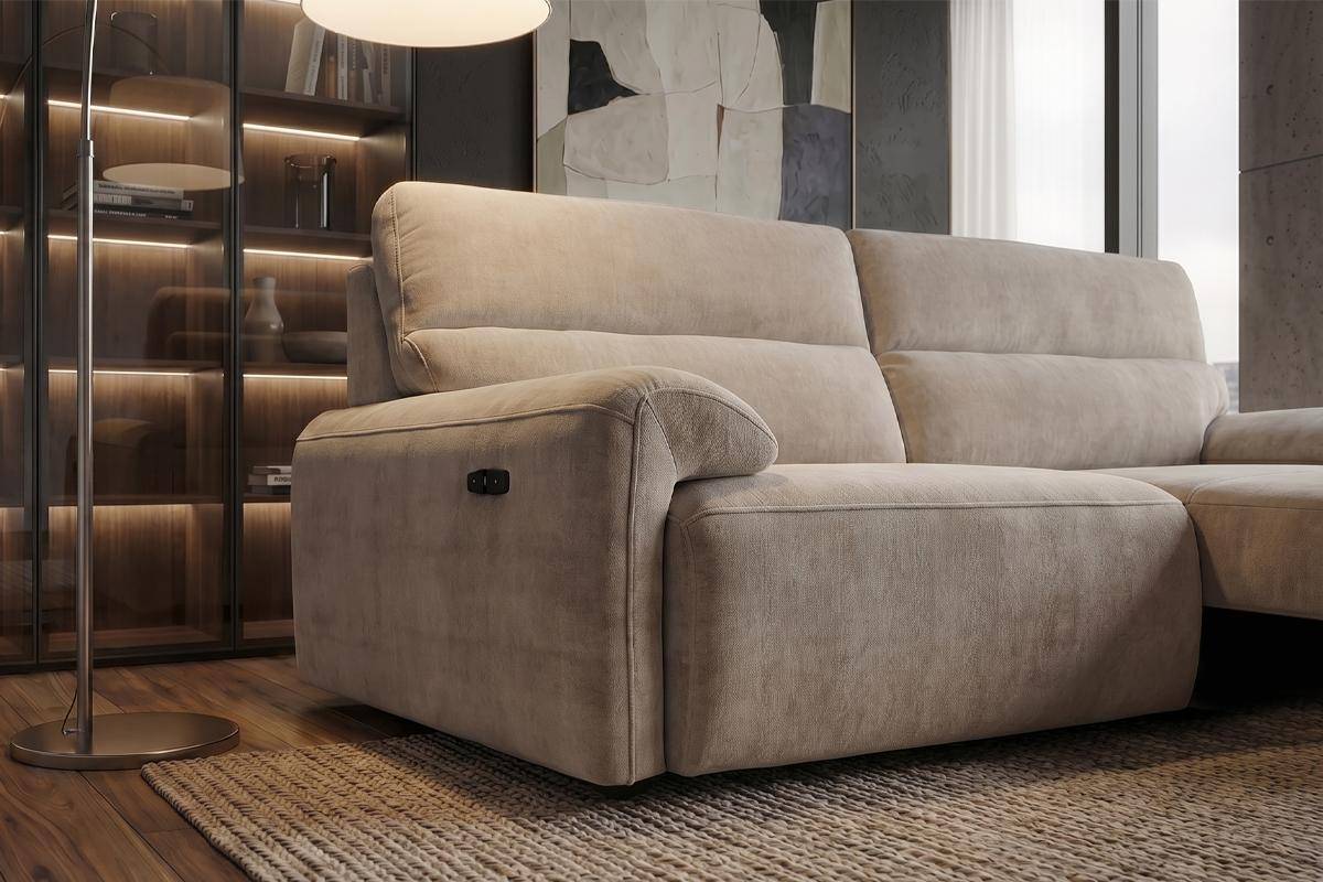 Divano 3 posti con 2 slitte elettriche, in tessuto antimacchia.