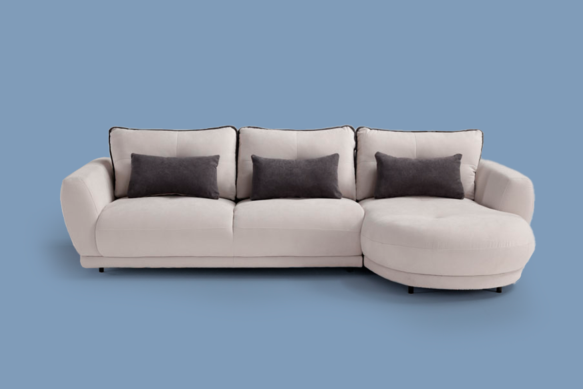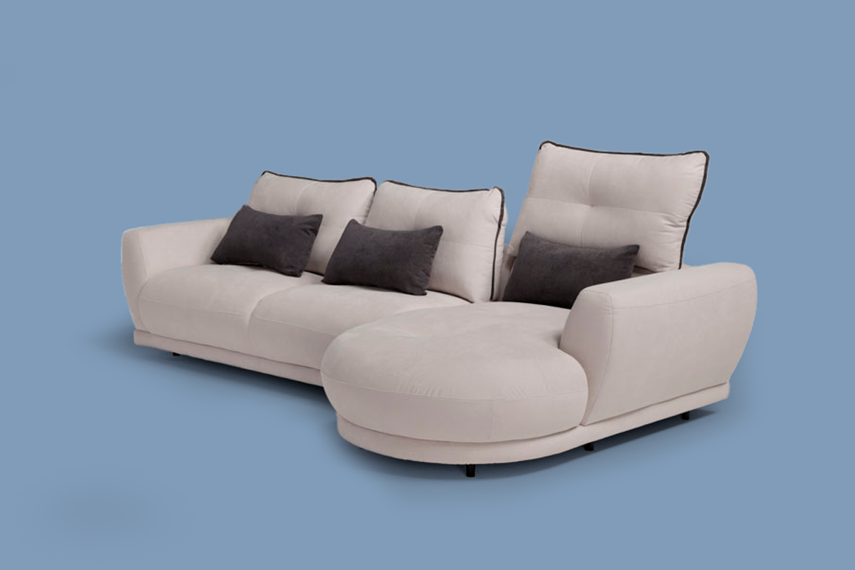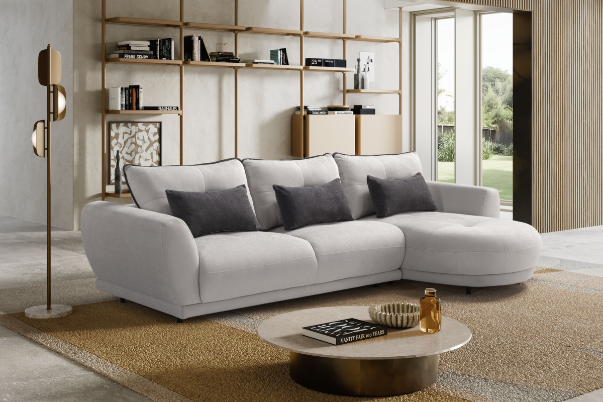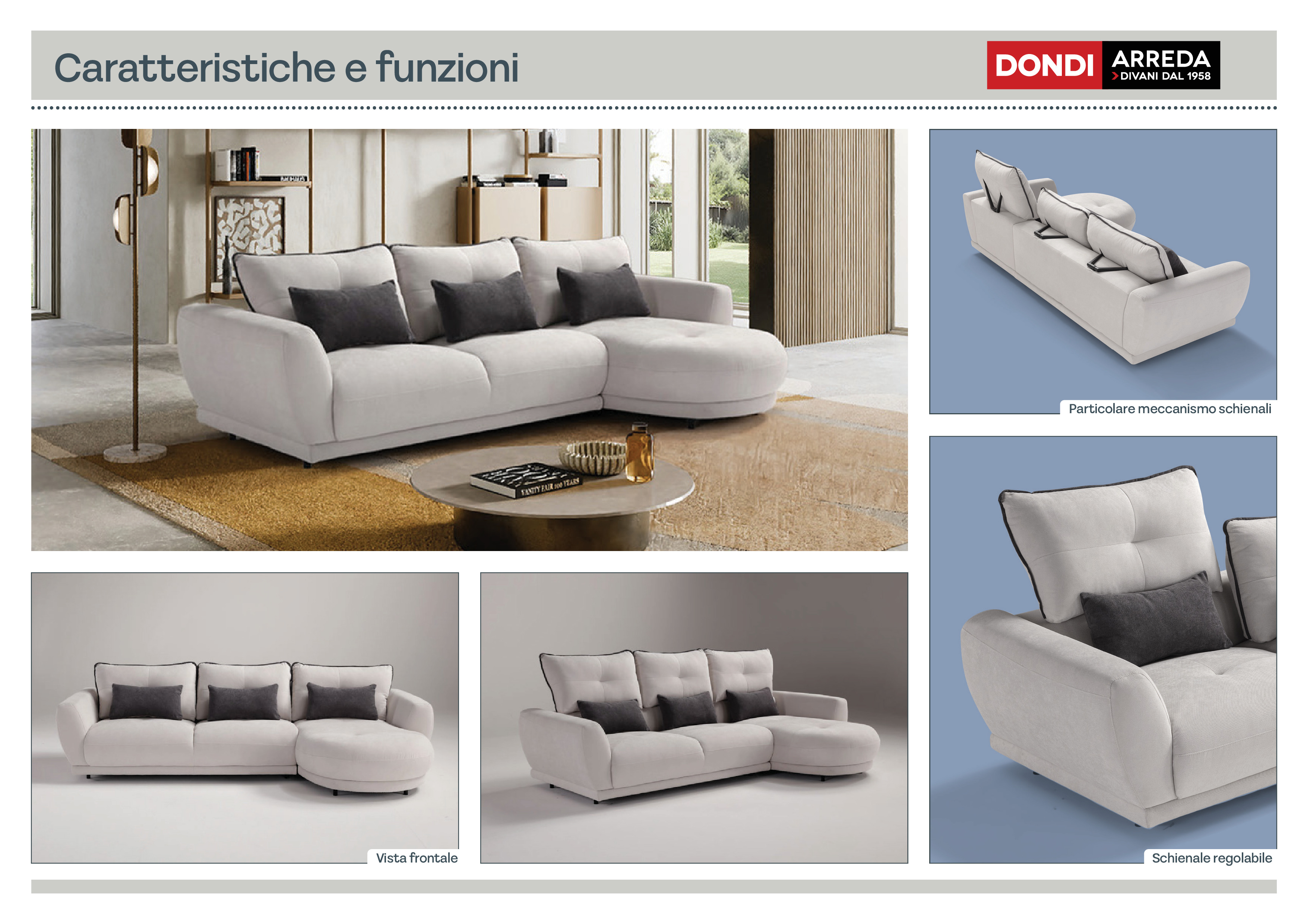 Divano con schienali regolabili in profondità e chaise longue, in microfibra antimacchia.