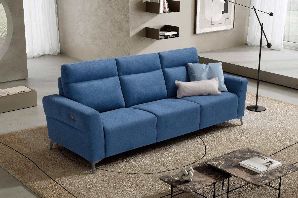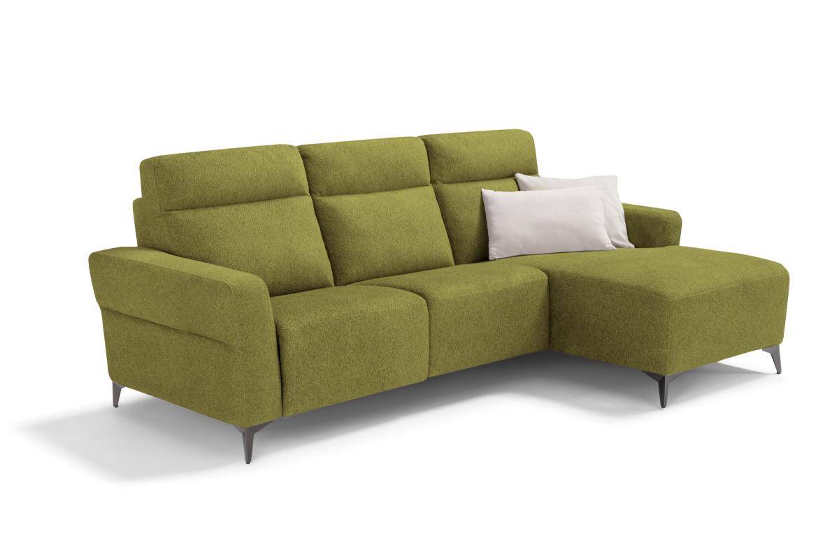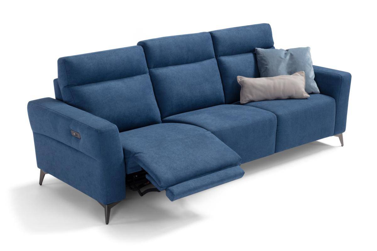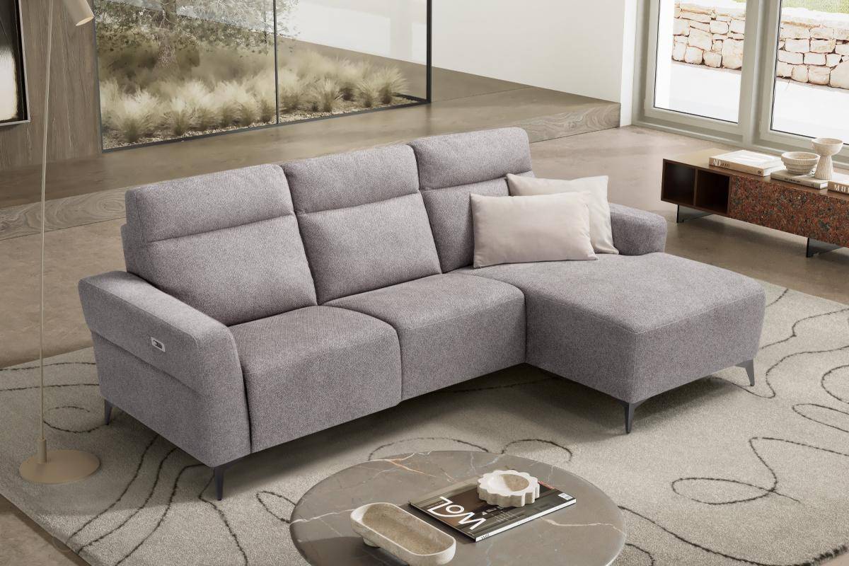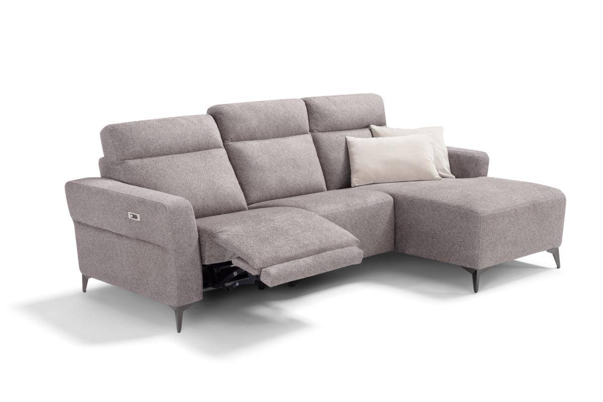 Divano con seduta relax elettrica e chaise longue, in tessuto antimacchia.