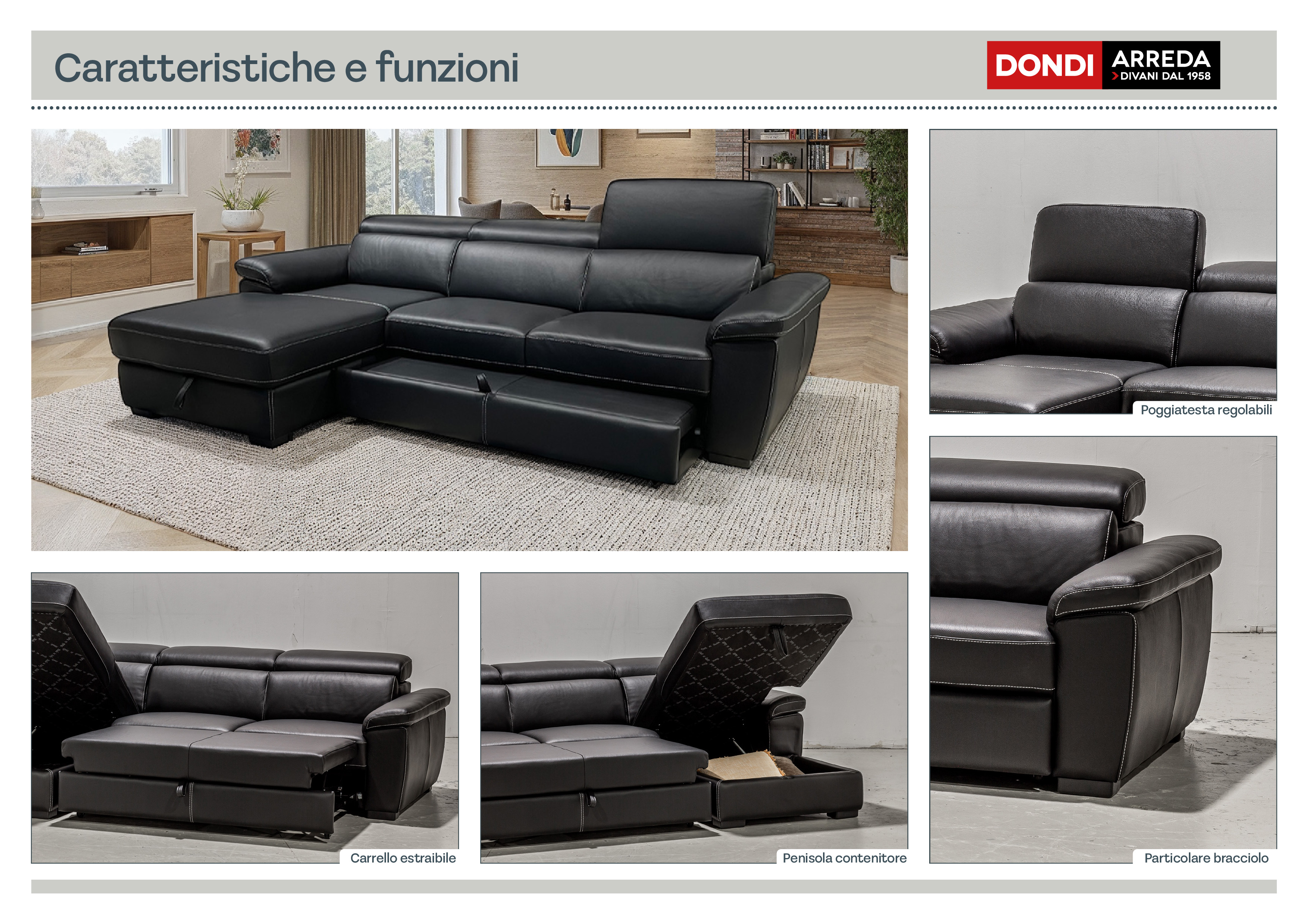 Divano con terminale intermedio con carrello e chaise longue contenitore, in vera pelle.