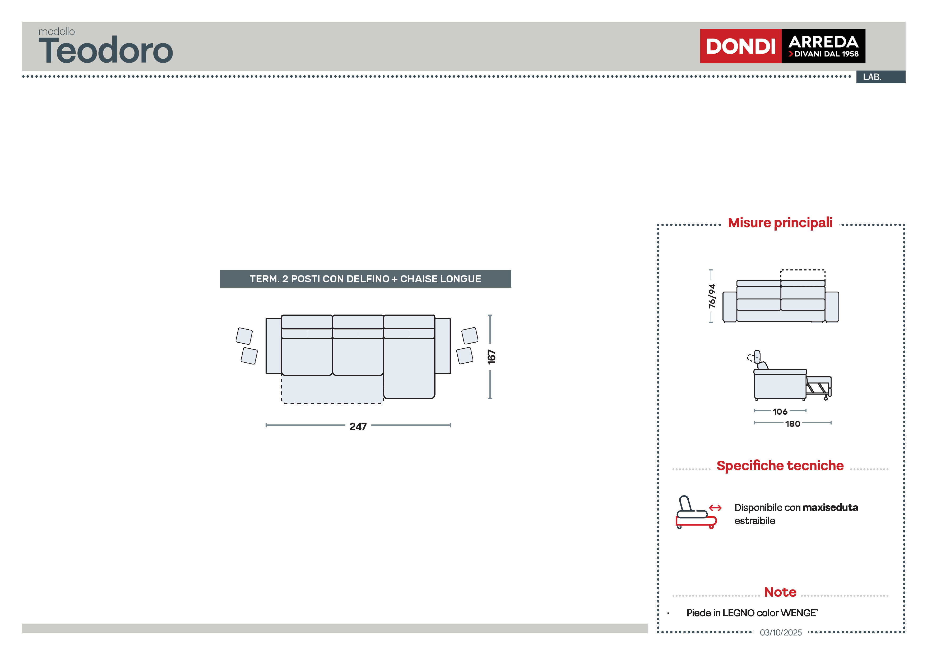 Dimensioni: L. 247 x P. 167 x H. 76/94 cm