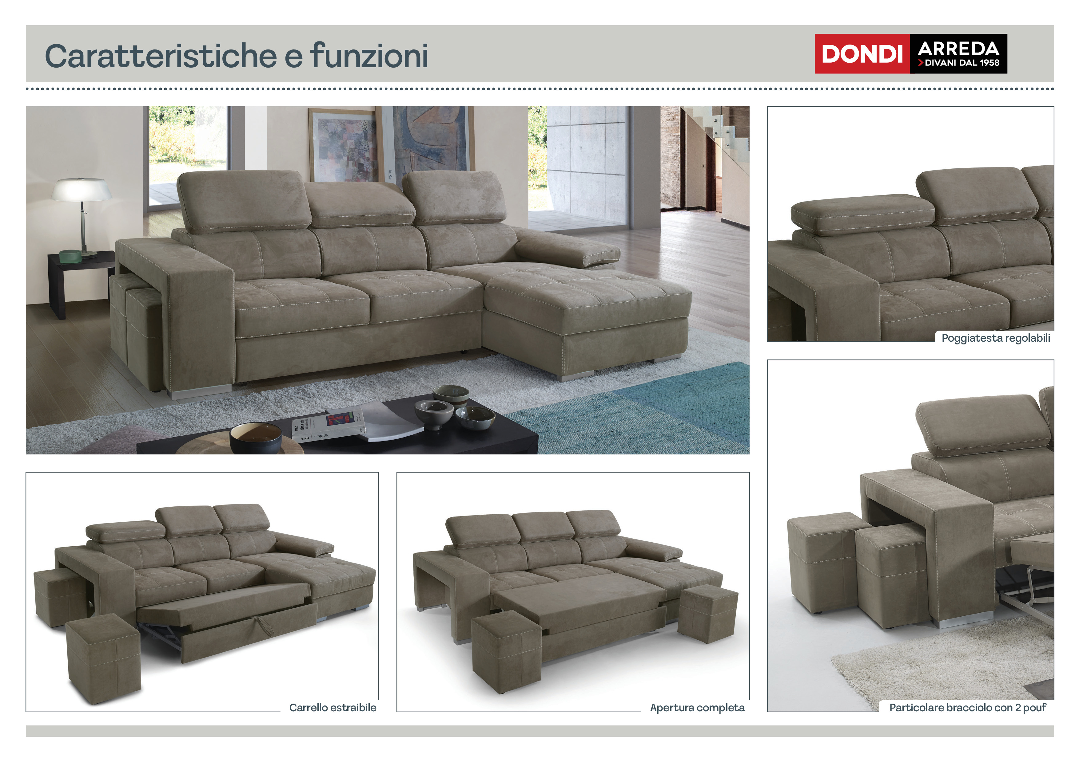 Angolare con carrello (delfino), braccioli con 2 pouf cad. e chaise longue, in tessuto antimacchia.