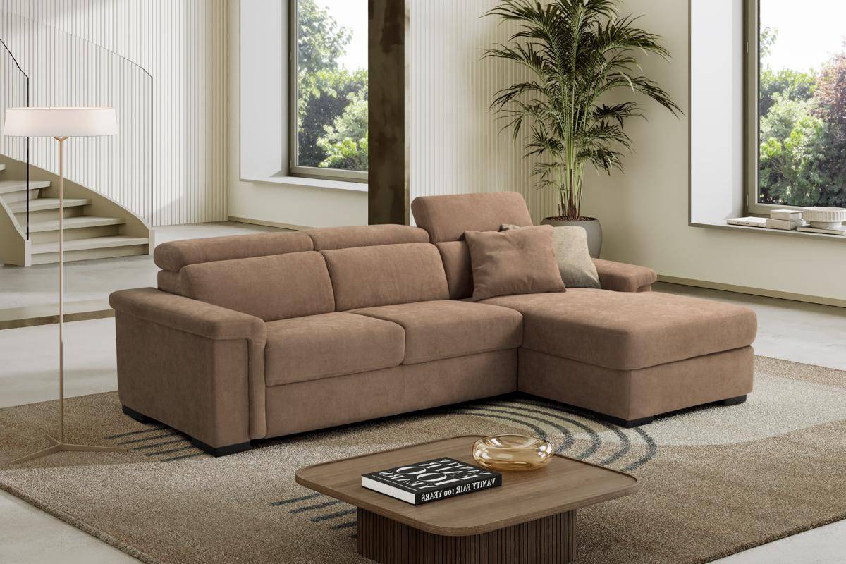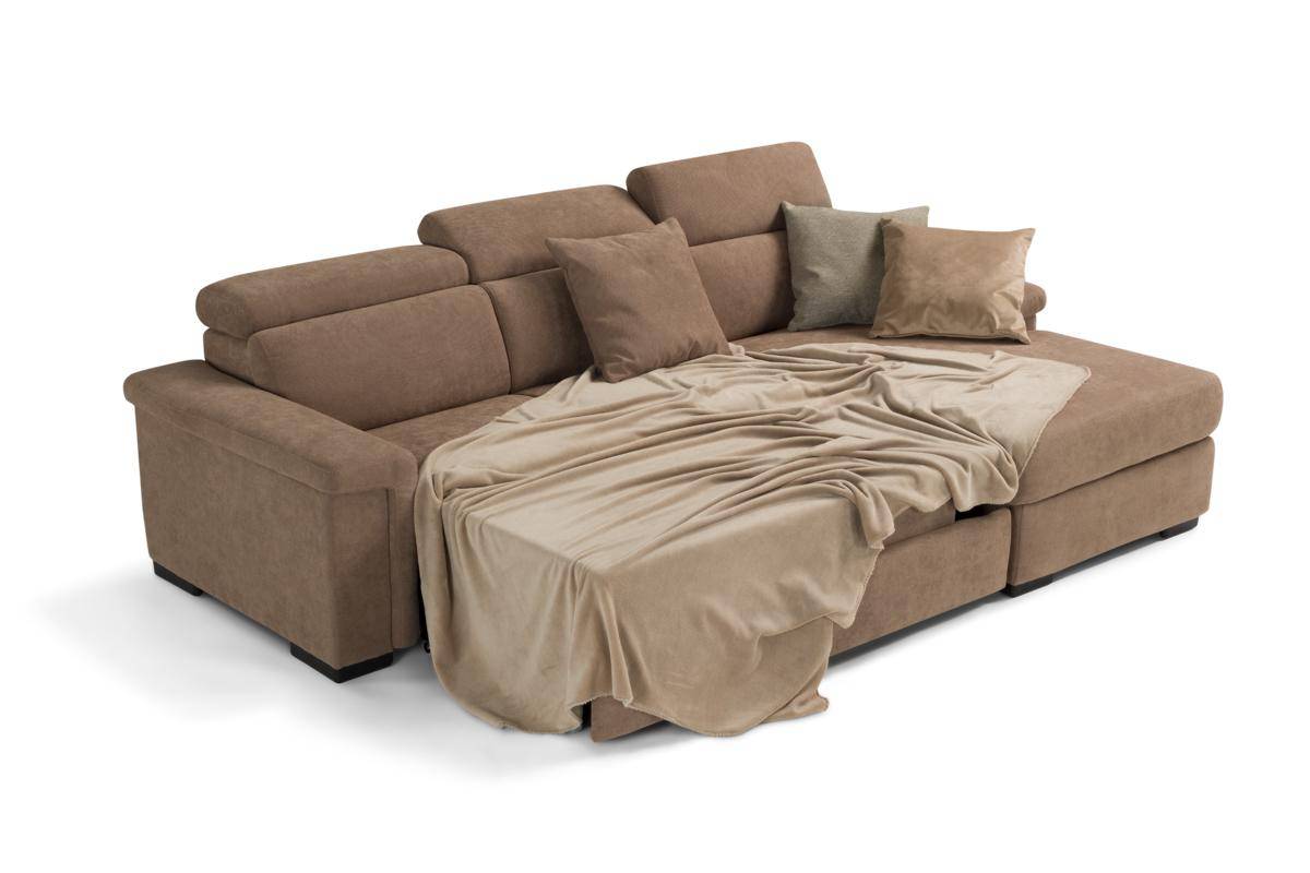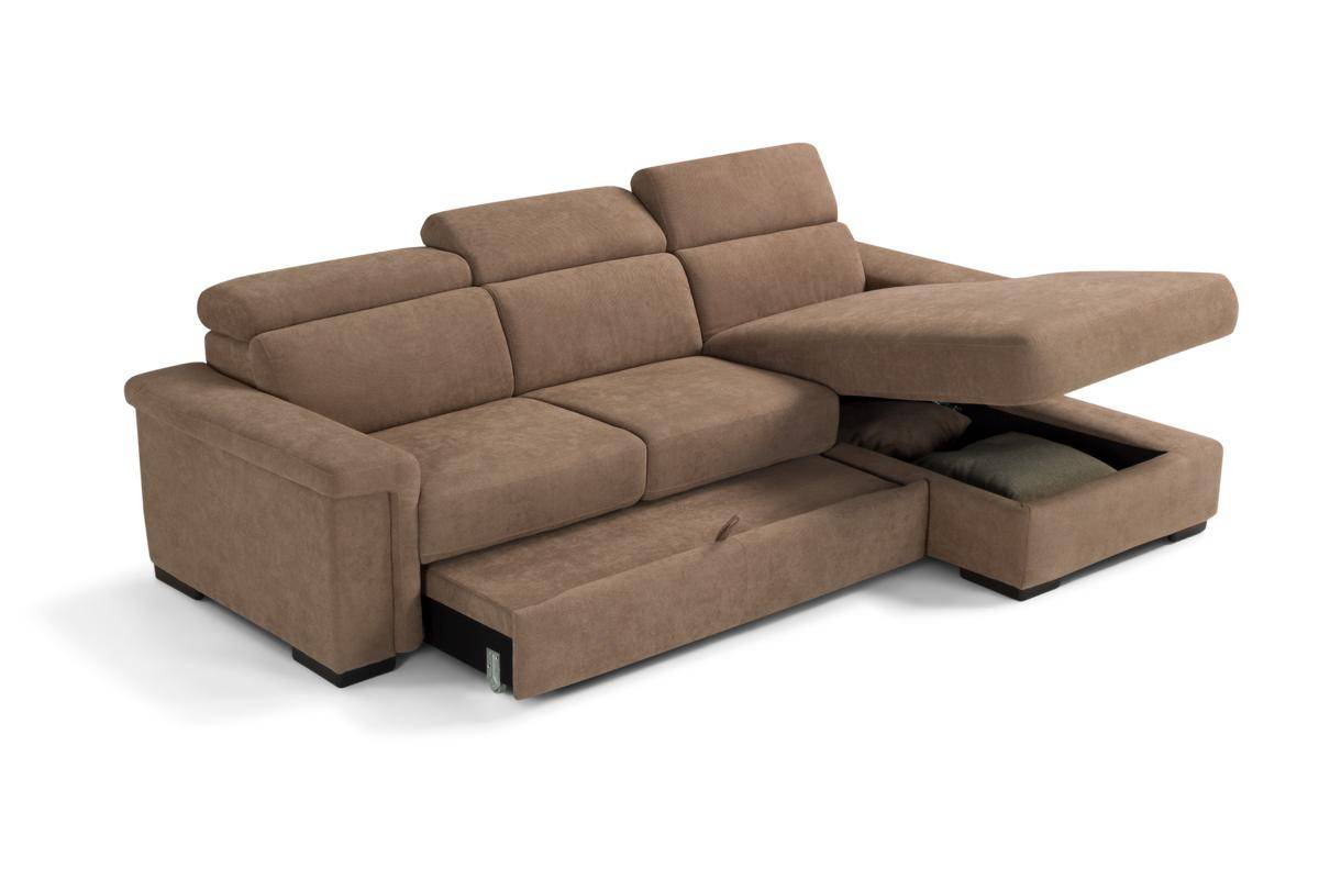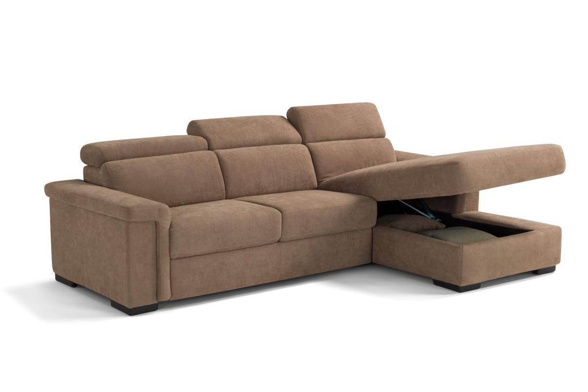 Divano con carrello estraibile e chaise longue contenitore, in tessuto antimacchia.