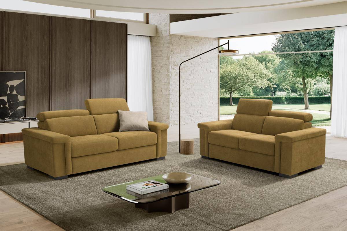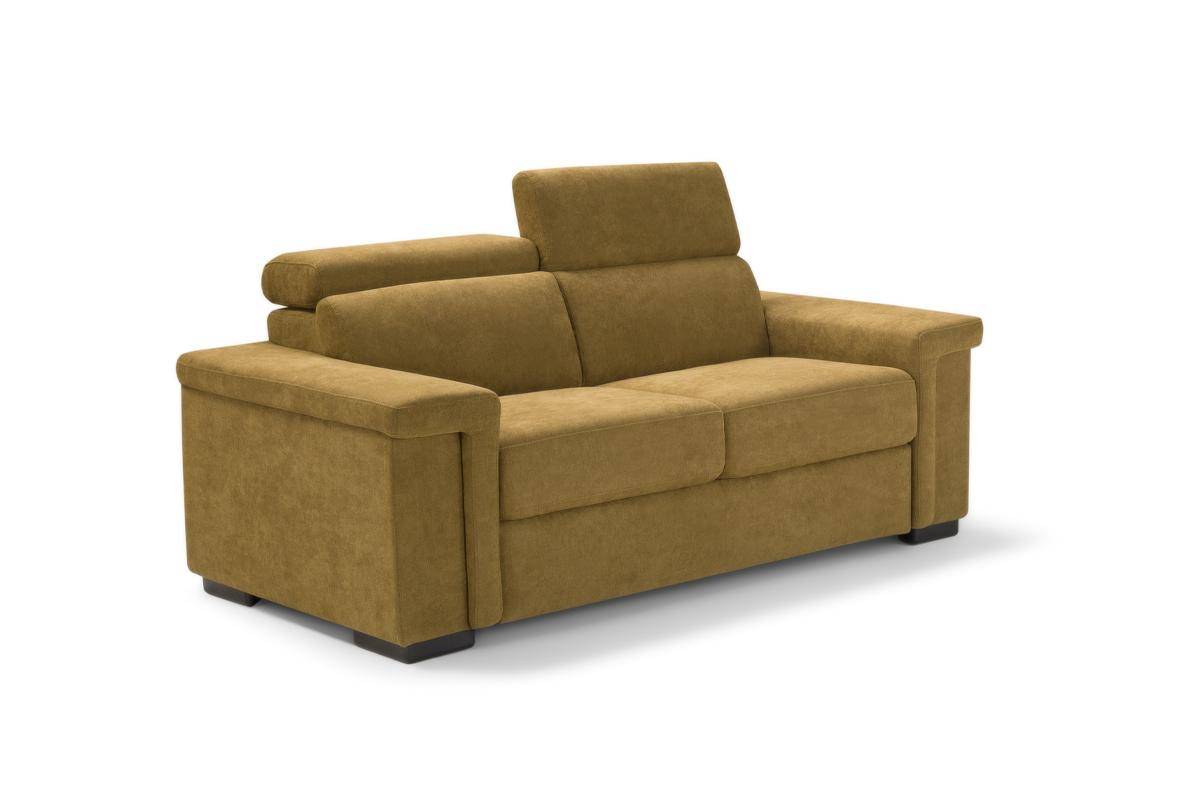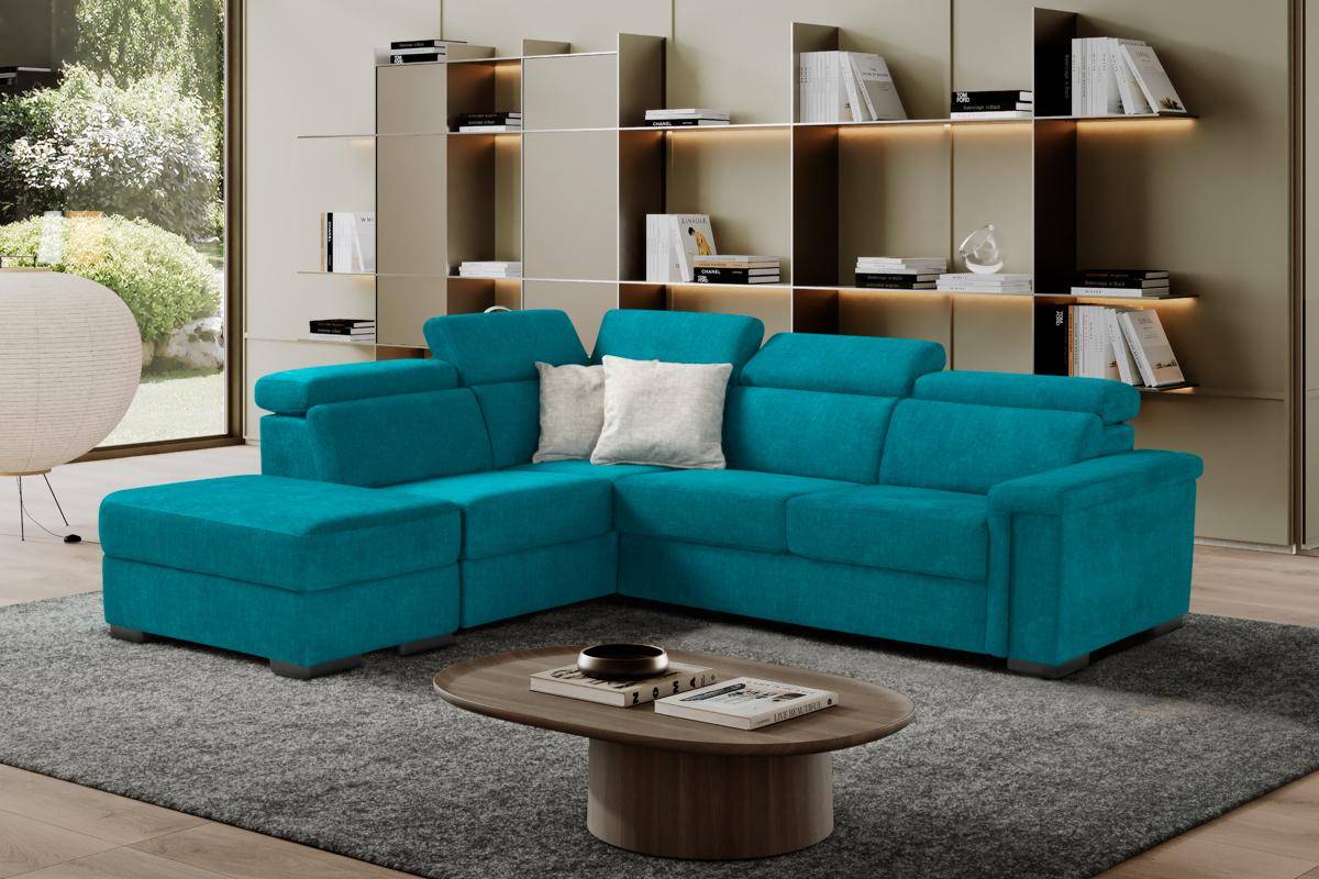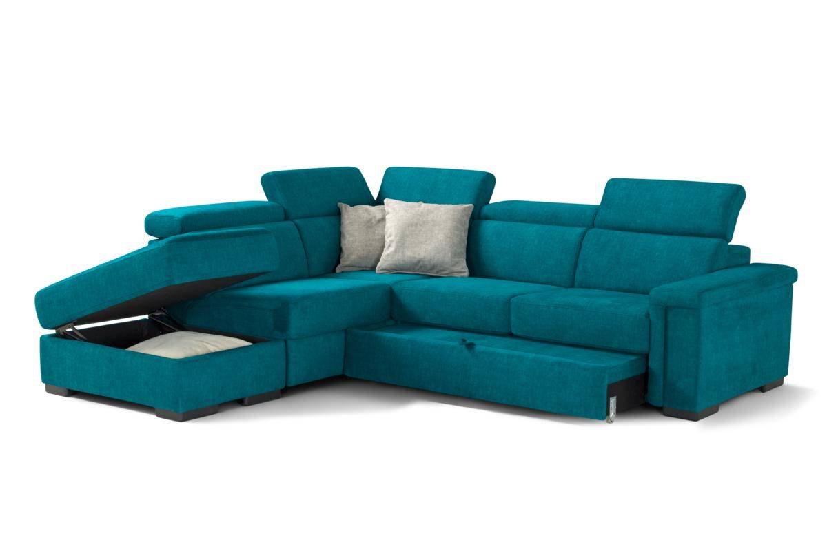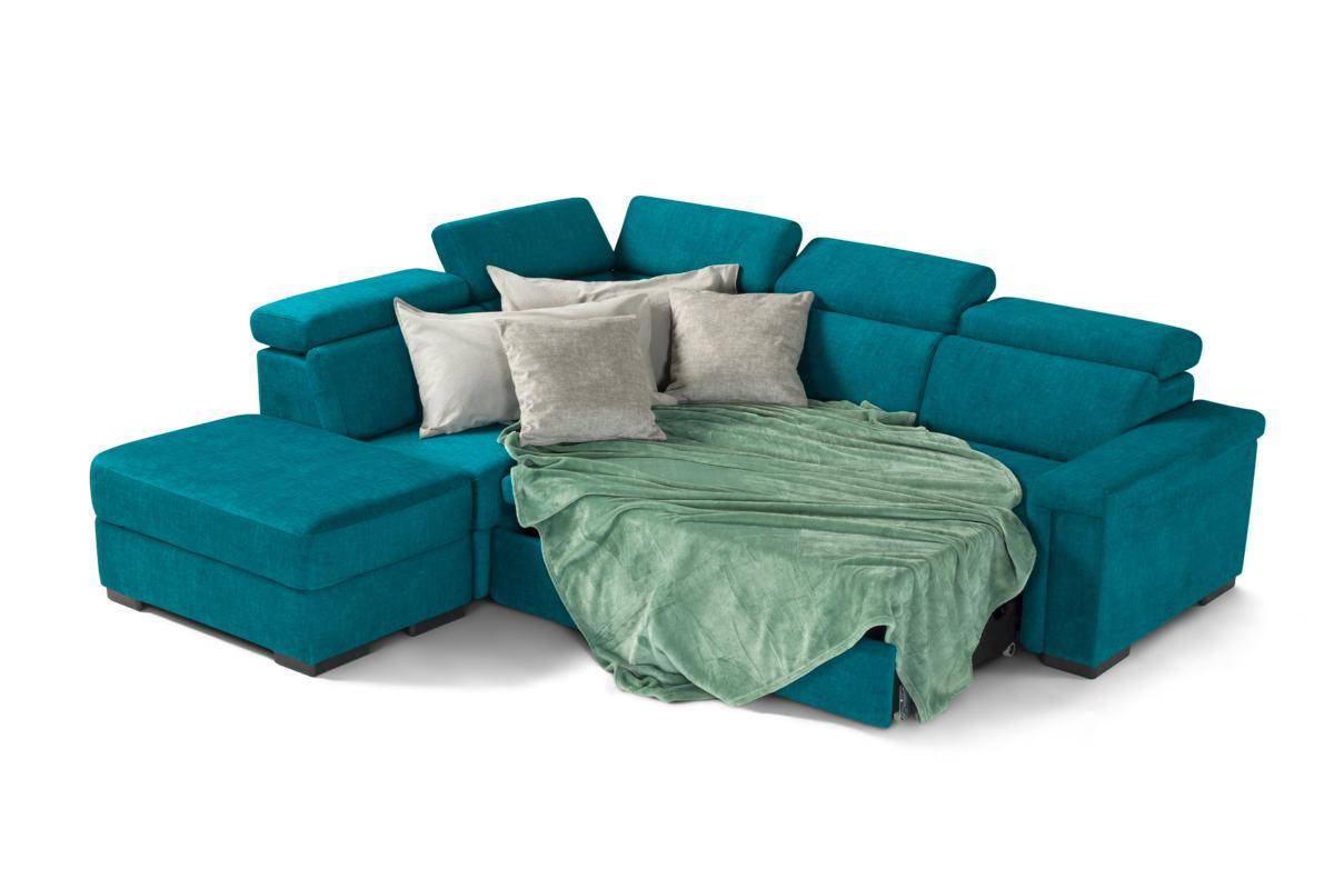 Divano con carrello estraibile e chaise longue contenitore, in tessuto antimacchia.
